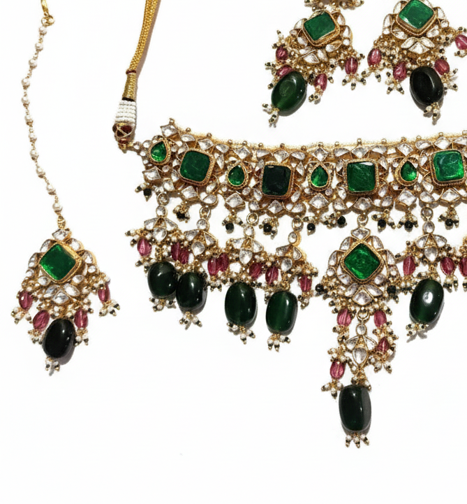 • Materials: High-grade gold-plated alloy, synthetic emerald-cut stones, deep green glass beads, and micro-pearl clusters.