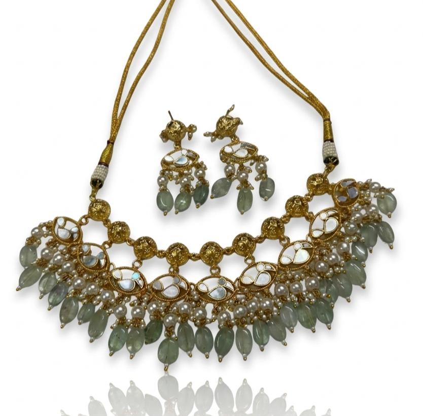 The necklace is finished with a stunning waterfall of mint-green semi-precious style beads interspersed with creamy white pearls, providing a rich texture and fluid movement. The matching drop earrings echo the necklace’s centerpiece design, creating a balanced and high-impact look that frames the face beautifully.