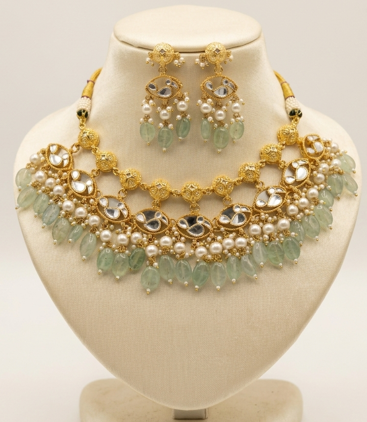 Styling Tip: This heavy set is best showcased with deep-neck blouses or off-shoulder ethnic gowns. Pair it with neutral silks or contrasting deep reds to make the mint stones truly stand out.