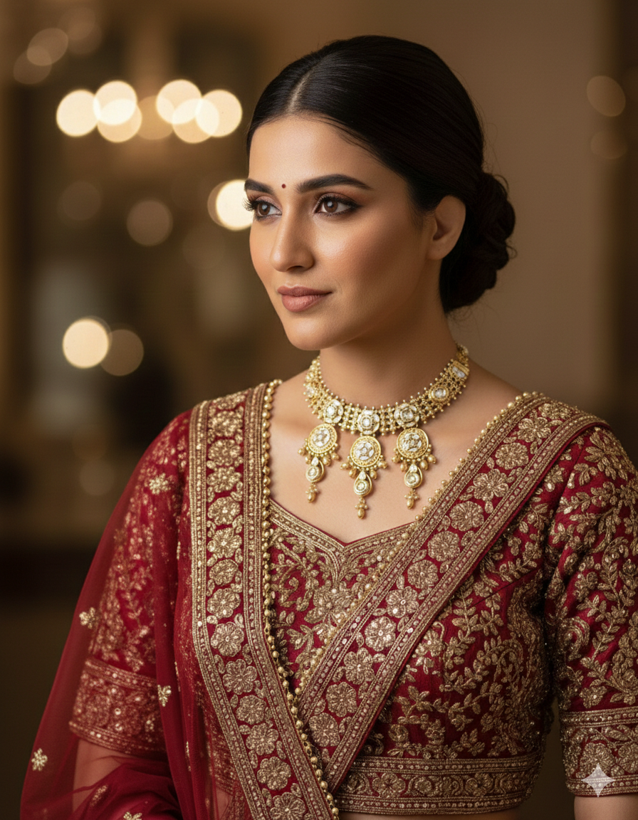 Regal Appeal: The structured design offers a “Choker-style” fit that sits beautifully against the neckline, making it an ideal companion for deep-neck blouses, silk sarees, and bridal Lehengas.