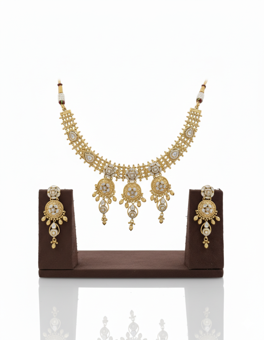 Design & Artistry: The necklace features a broad, textured collar band adorned with shimmering white stones and floral engravings. The focal point consists of three majestic circular medallions, each intricately set with Kundan polki accents and finished with a cascade of golden beads and teardrop elements.
