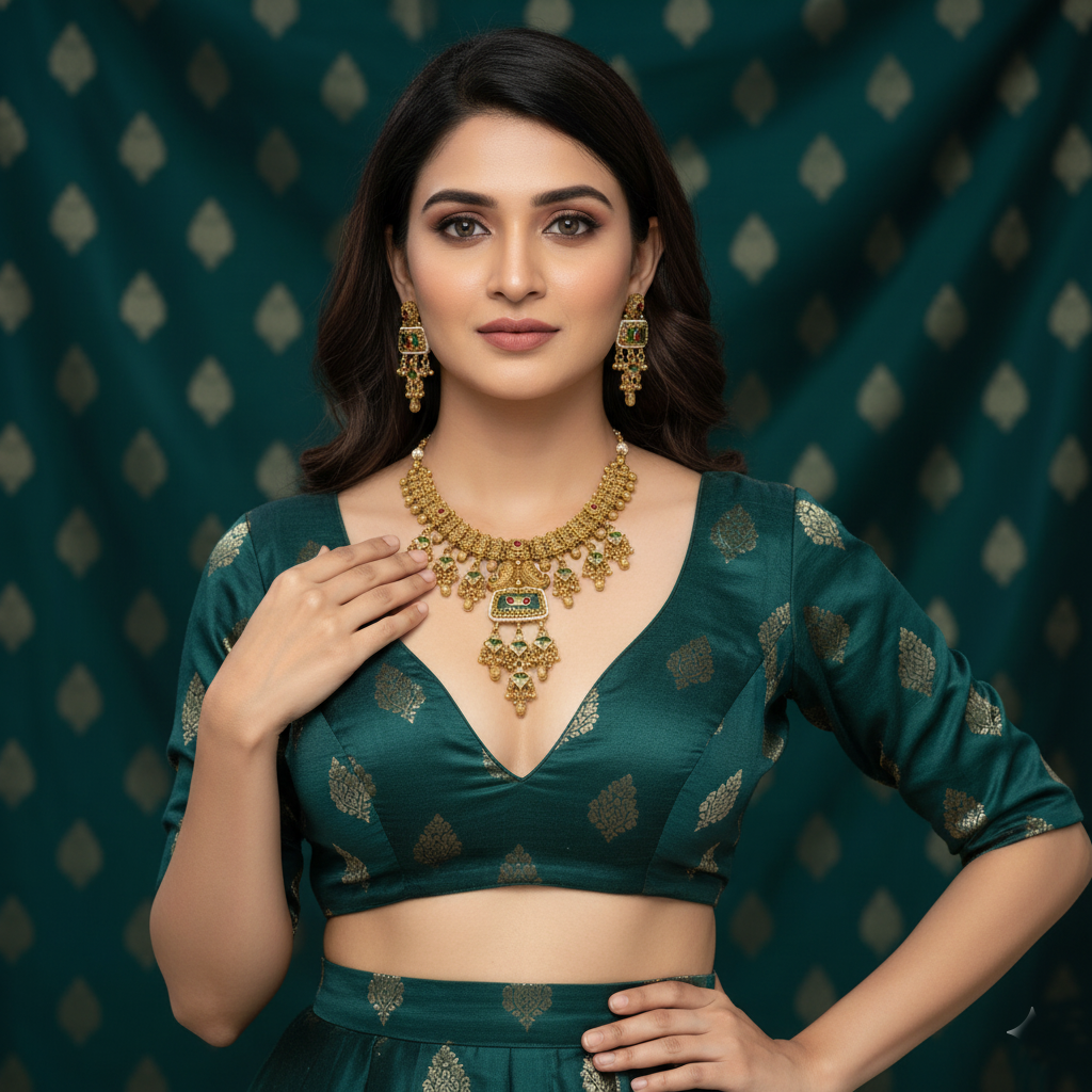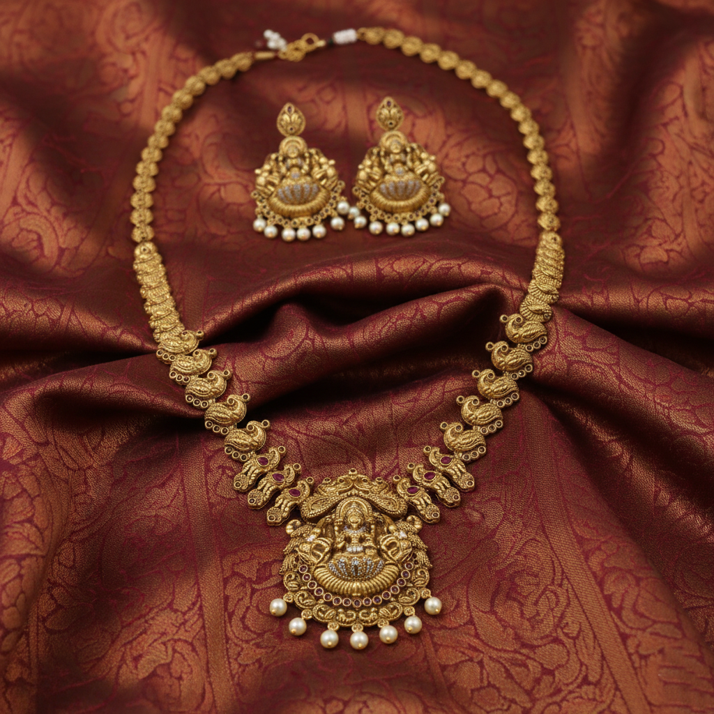 Drape yourself in the splendor of royal Indian heritage with this masterfully crafted temple-style ensemble. This set is a celebration of classic symbolism and high-definition metalwork.