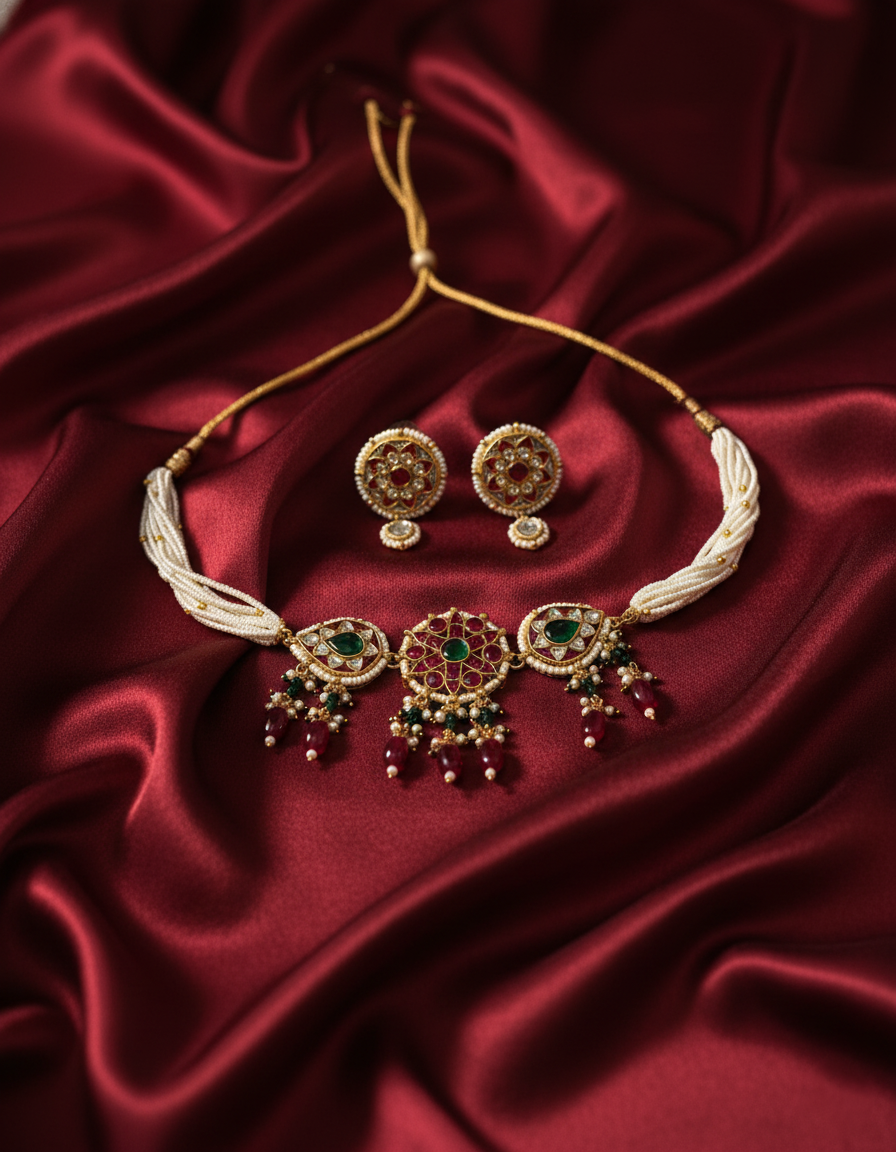 A majestic multi-strand seed pearl necklace featuring three intricately crafted Kundan medallions with ruby and emerald-style stone inlays. Accented with cascading ruby-colored droplets and paired with matching circular studs, this set is a quintessential choice for grand weddings and festive galas.