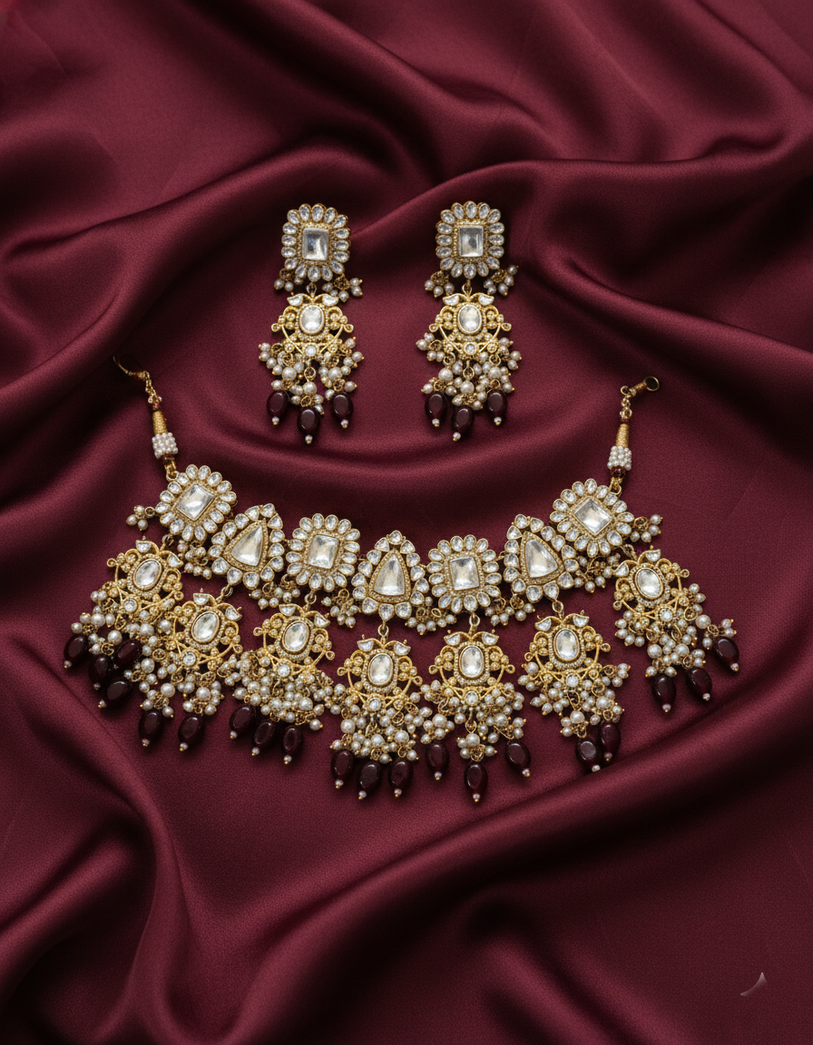 Matching Statement Earrings: The set comes with a pair of long, tiered drop earrings. The top stud mirrors the square motif of the choker, while the dangling base echoes the pearl and maroon beadwork, ensuring a balanced and regal appearance.