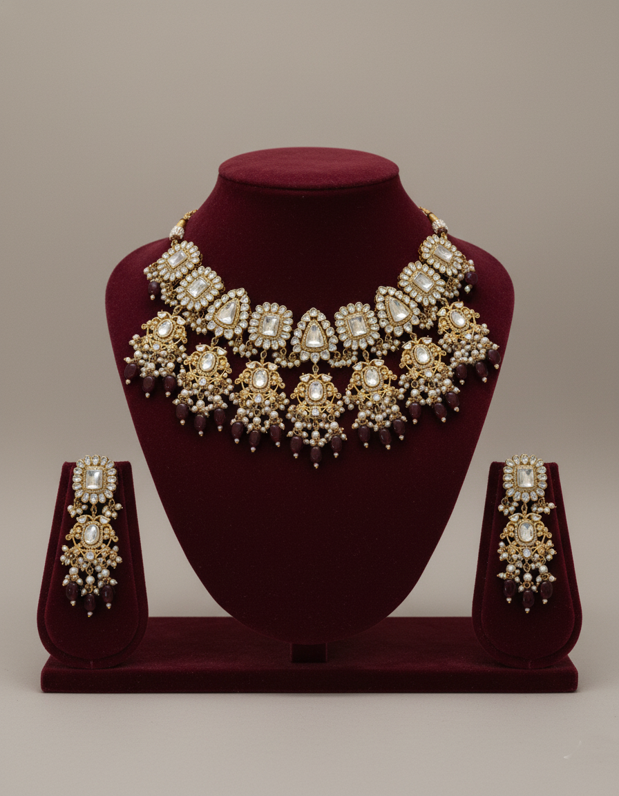 A grand gold-plated bib-style choker featuring an array of square and teardrop-shaped Polki Kundan stones. Accentuated by delicate pearl clusters and deep burgundy-maroon droplets, this set includes matching tiered drop earrings for a truly majestic aesthetic.
