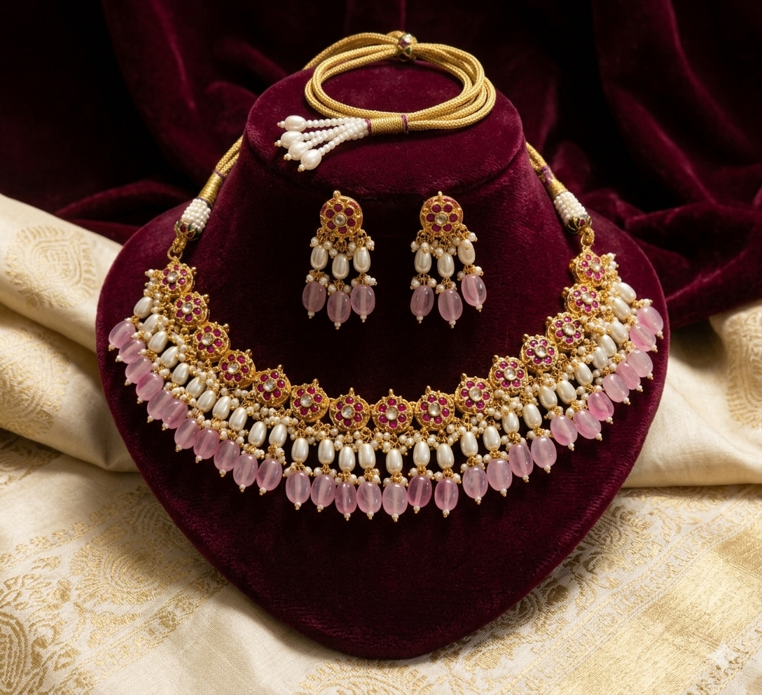 An exquisite gold-toned choker adorned with intricate floral ruby-style motifs and a lush, tiered fringe of translucent rose quartz beads and ivory pearls. Complete with matching floral drop earrings, this set offers a perfect blend of vintage charm and modern pastel aesthetics.