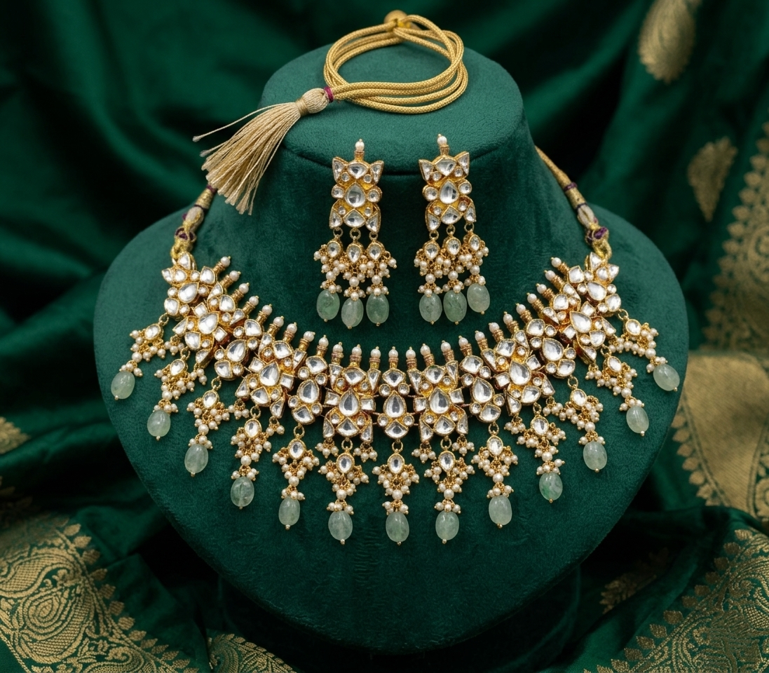 Styling Tip: This set pairs beautifully with silver-grey, ivory, or pastel pink silk sarees. It is an ideal accessory for spring weddings, garden parties, or festive receptions.