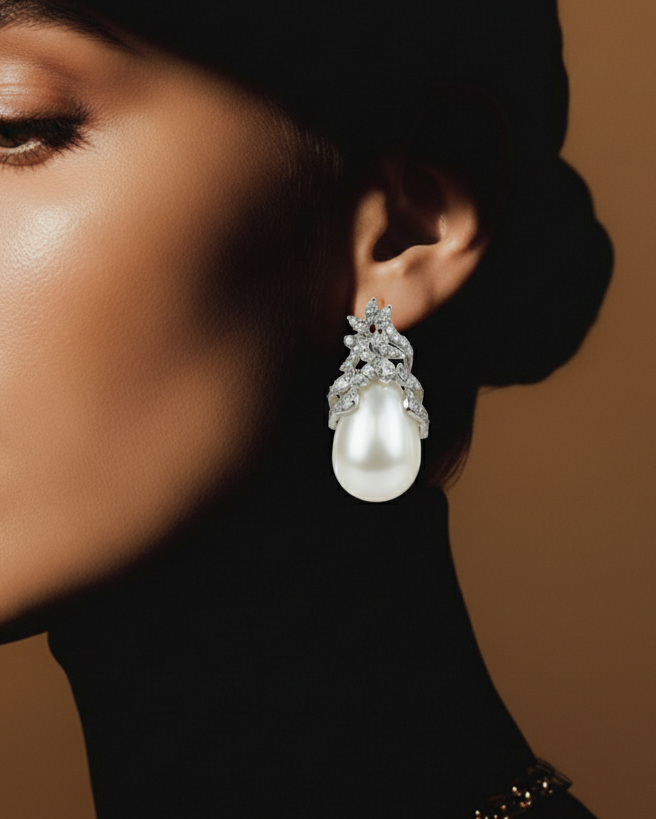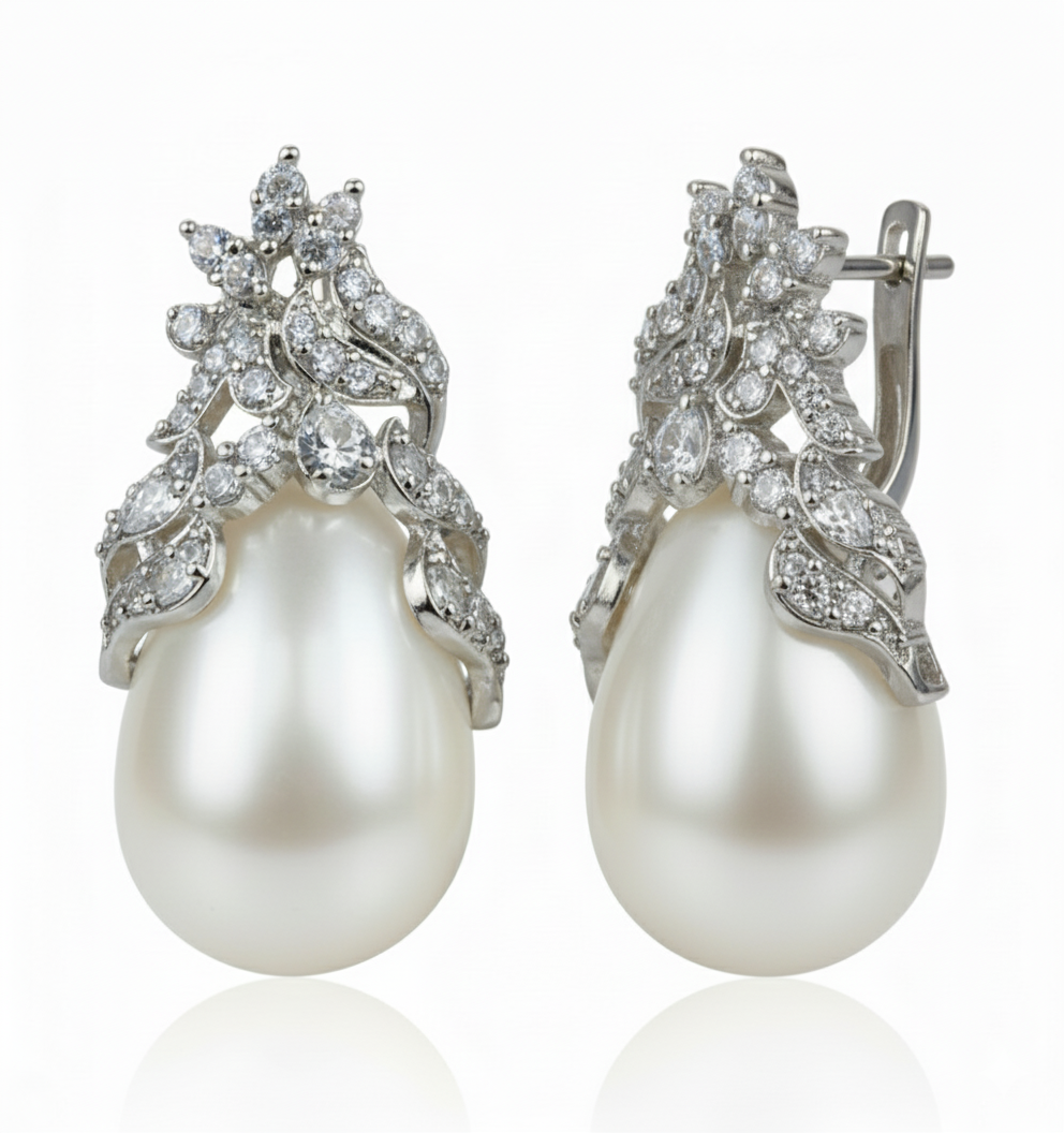 Indulge in pure elegance with these breathtaking Imperial Drop Earrings. Each earring showcases a large, high-luster teardrop pearl, celebrated for its smooth surface and creamy white radiance. The pearl is crowned by an intricate, vintage-inspired scroll motif crafted in a polished silver-finish mounting. This ornate topper is pavé-set with shimmering round brilliant-cut stones, adding a layer of sophisticated sparkle that perfectly balances the soft glow of the pearl. Combining timeless grace with high-end artisanal detailing, these earrings are the ultimate accessory for brides, formal gala events, or grand celebratory evenings.