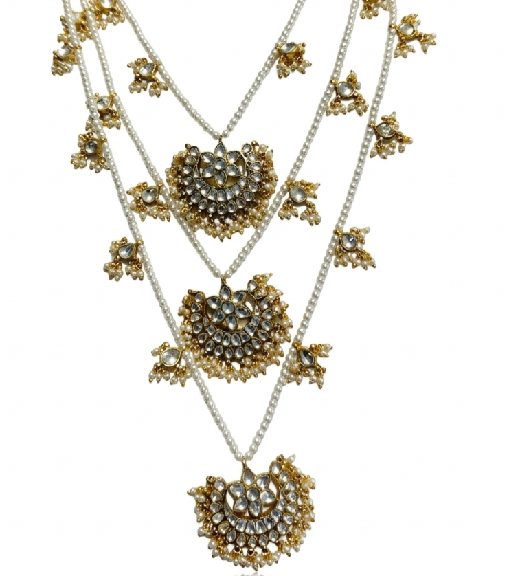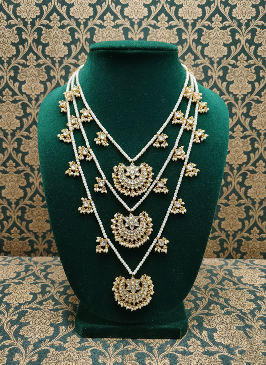 Exude timeless grace with this exquisite triple-layered pearl Satlada necklace. Featuring three tiers of delicate seed pearls and artisanal Polki-style crescent moon (Chandbali) charms, this “Antique-Luxe” piece is a regal choice for high-end festive and bridal collections.