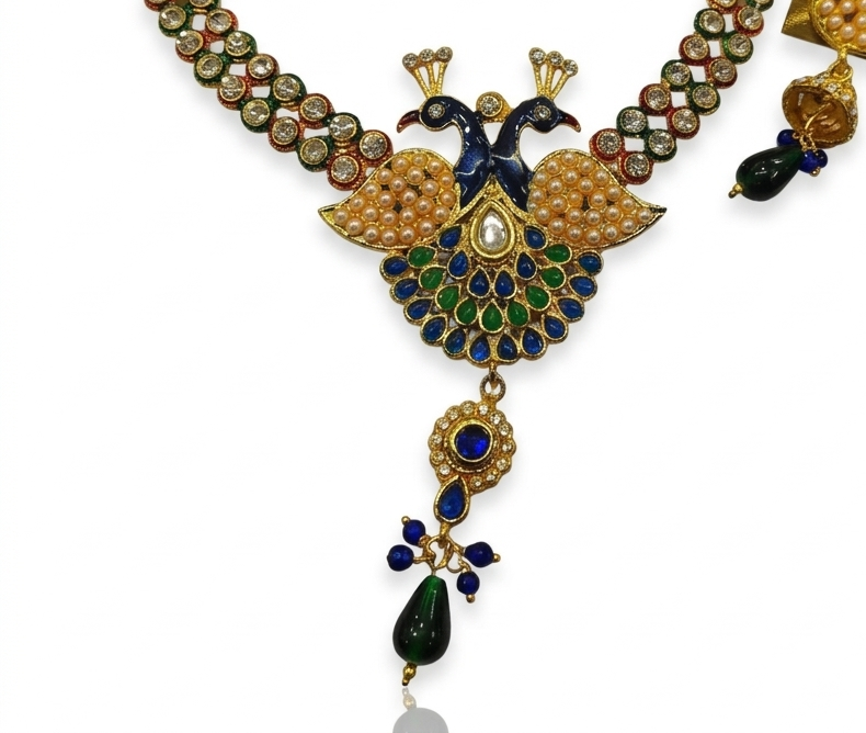 Exude majestic charm with this handcrafted Meenakari necklace set, featuring a grand twin-peacock central pendant. Adorned with intricate pearl-textured wings, vibrant blue enamel work, and cascading emerald-green bead drops, this heritage-inspired set is the perfect statement piece for high-end festive and bridal wear.