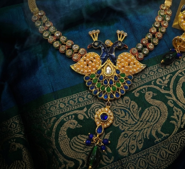 Imperial Peacock Motif: The centerpiece features a stunning dual-peacock design, symbolizing grace and royalty. The bodies are finished in deep royal blue Meenakari (enameling), while the expansive wings are meticulously textured with pearl-style mosaics.
