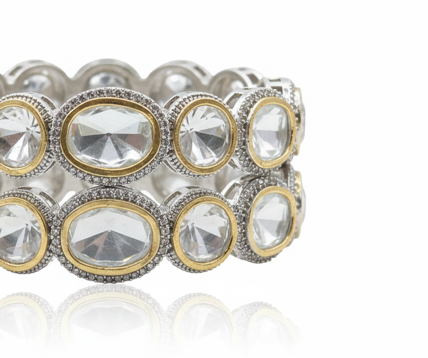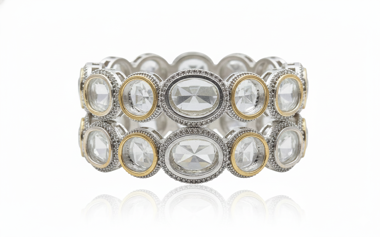Redefine elegance with the Imperial Two-Tone Polki Diamond Bangles. These striking pieces feature a sequence of oversized, oval-shaped rose-cut stones that emulate the vintage charm of Polki diamonds. Each stone is cradled within a unique dual-metal setting: a slender inner ring of polished yellow gold is surrounded by a broad outer border of shimmering silver-tone pavé.
