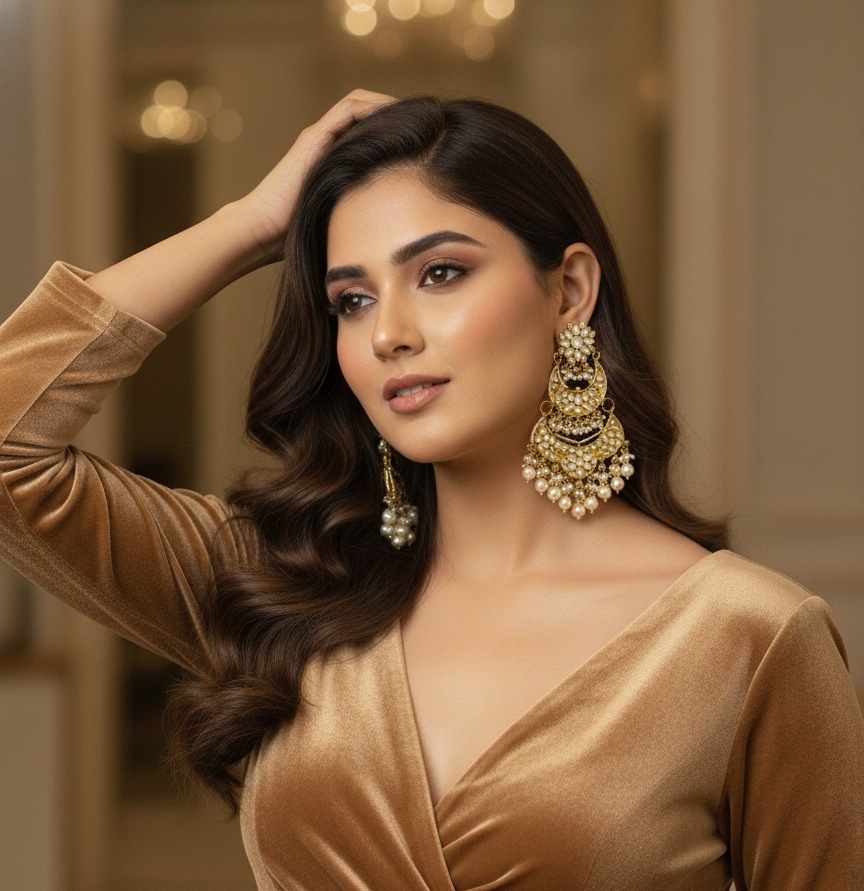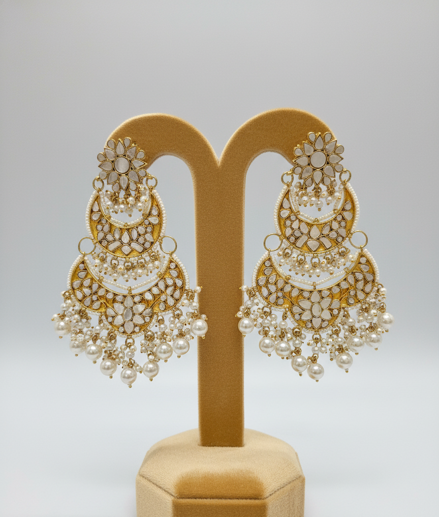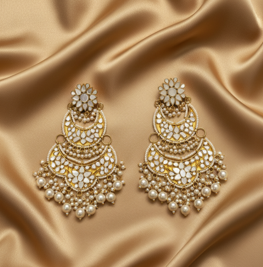 Make a grand statement with these stunning Multi-Tier Chandbali Earrings, a true representation of royal Indian jewelry. These earrings feature a sophisticated double-crescent design, meticulously inlaid with high-quality Kundan stones in a traditional floral and petal arrangement. The gold-toned base provides a warm, opulent glow, while the cascading cluster of creamy white pearls adds fluid movement and a touch of vintage charm. Crowned with a shimmering floral stud, these heavy-work earrings are designed for the modern bride or for those seeking to add a majestic touch to their festive ensemble.
