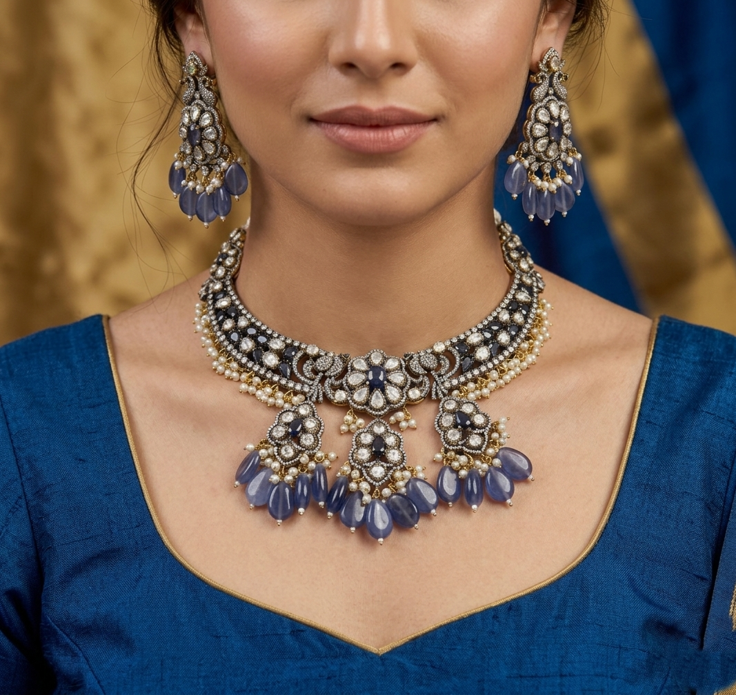 • The Choker Base: The necklace features five luxurious strands of fine lilac-grey pearls, providing a textured and broad drape that sits elegantly against the neck.
