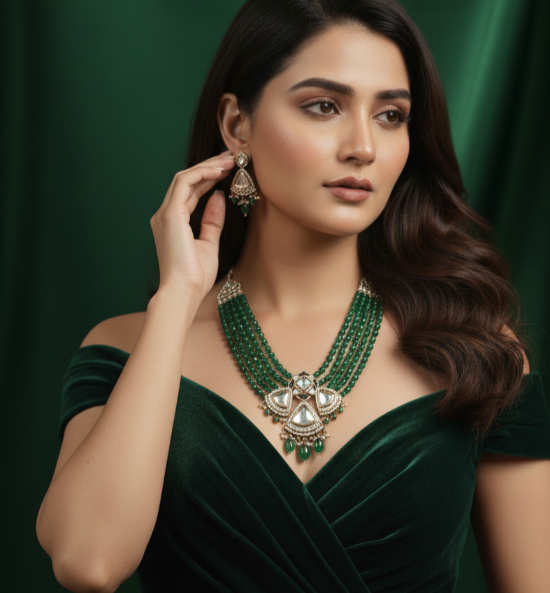 • The Intricate Fringe: Each green drop is suspended from a Kundan-encrusted cap and finished with clusters of tiny, lustrous white seed pearls, adding a touch of traditional paronthi style and graceful movement.
