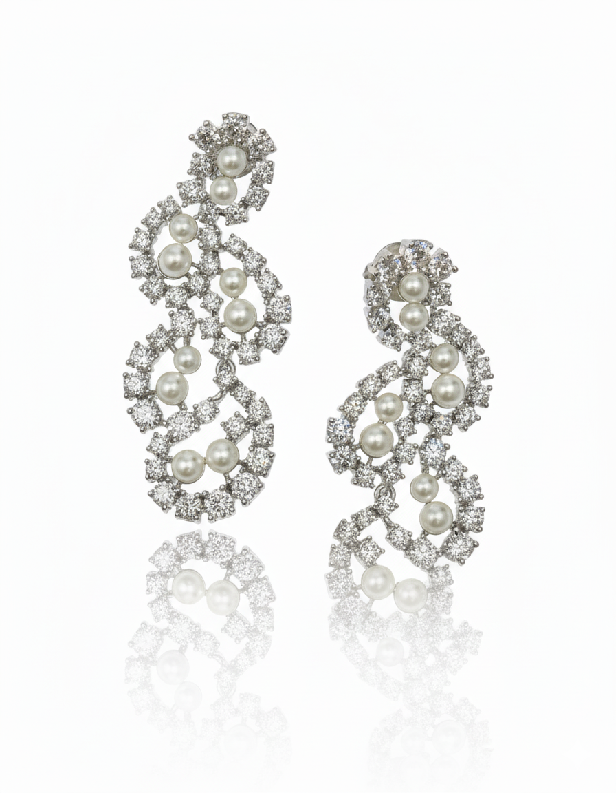 A masterpiece of fluid elegance. These captivating drop earrings feature a rhythmic swirl of brilliant-cut diamonds interspersed with luminous white pearls. With a graceful, vine-inspired silhouette and a sharp mirror-reflection finish, they are the ultimate accessory for a sophisticated bridal or red-carpet look.