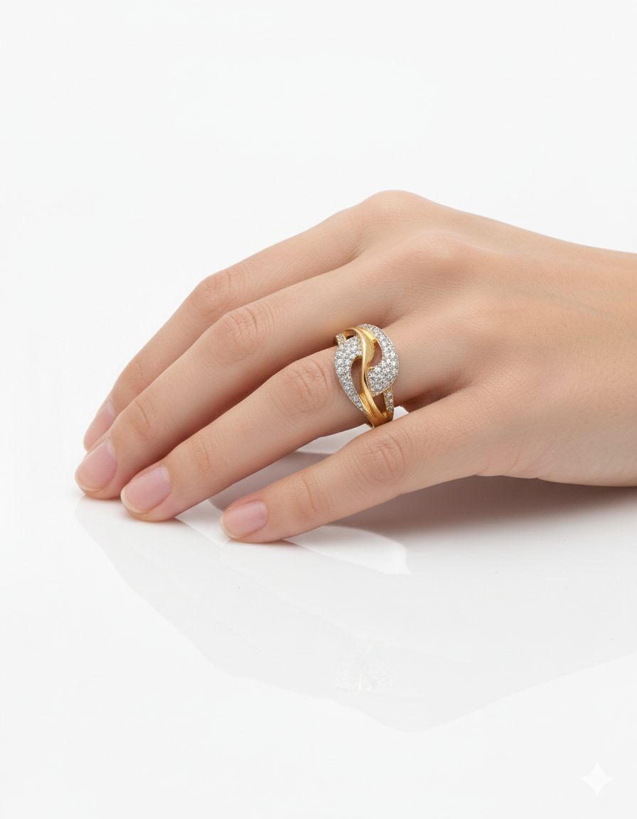 Elevate your jewelry collection with this masterfully designed wave ring, a perfect fusion of artistry and glamour. The ring features sweeping, intertwined bands of polished gold-toned metal and shimmering stone-studded paths, creating a dynamic 3D effect that catches the light from every angle.