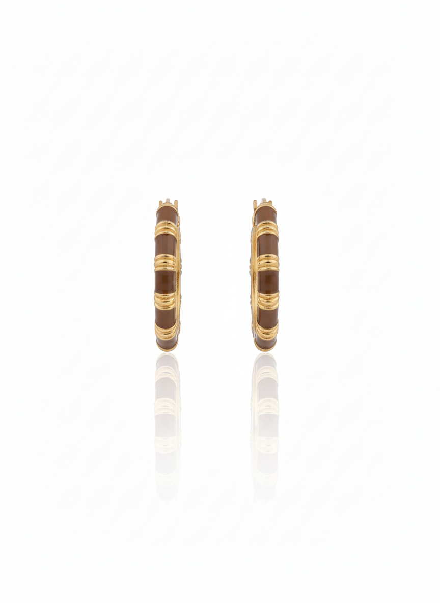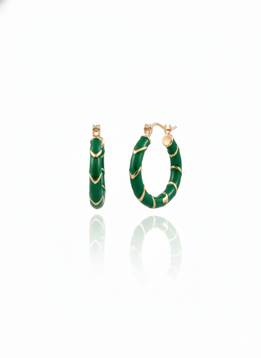 Infuse your look with a touch of royal charm. These sophisticated hoop earrings feature a deep emerald green enamel finish accented by radiant gold-plated chevron inlays. Their sleek, contemporary silhouette makes them a perfect statement piece for any occasion.