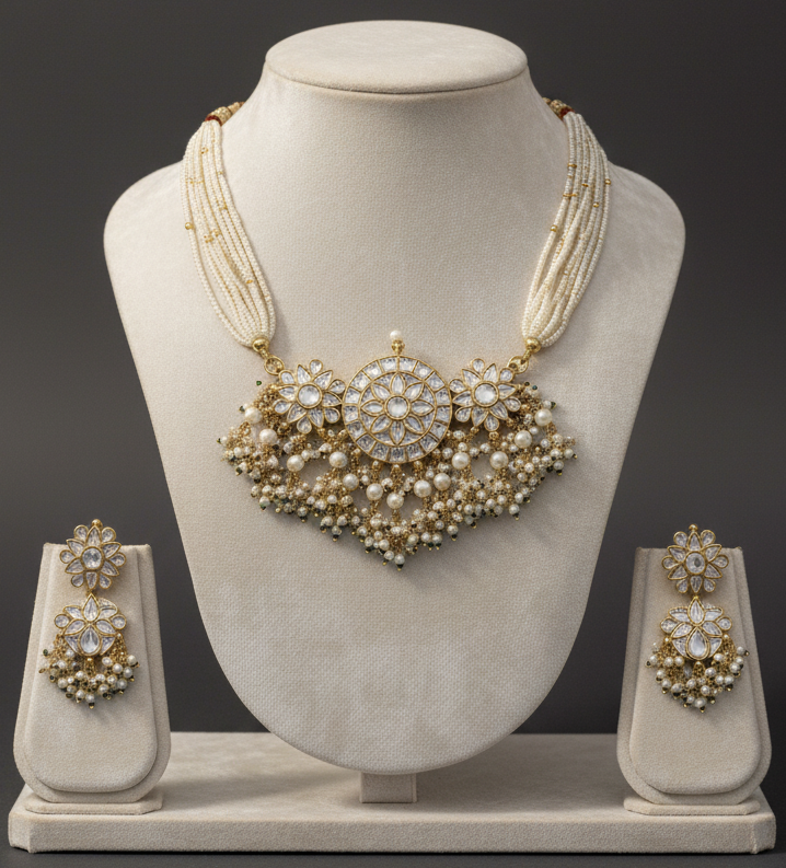 A majestic jewelry set featuring a large, tiered floral Kundan pendant suspended from seven rows of fine seed pearls. Accompanied by matching floral drop earrings and finished with intricate pearl clusters, this set epitomizes royal Indian heritage and sophisticated grace.