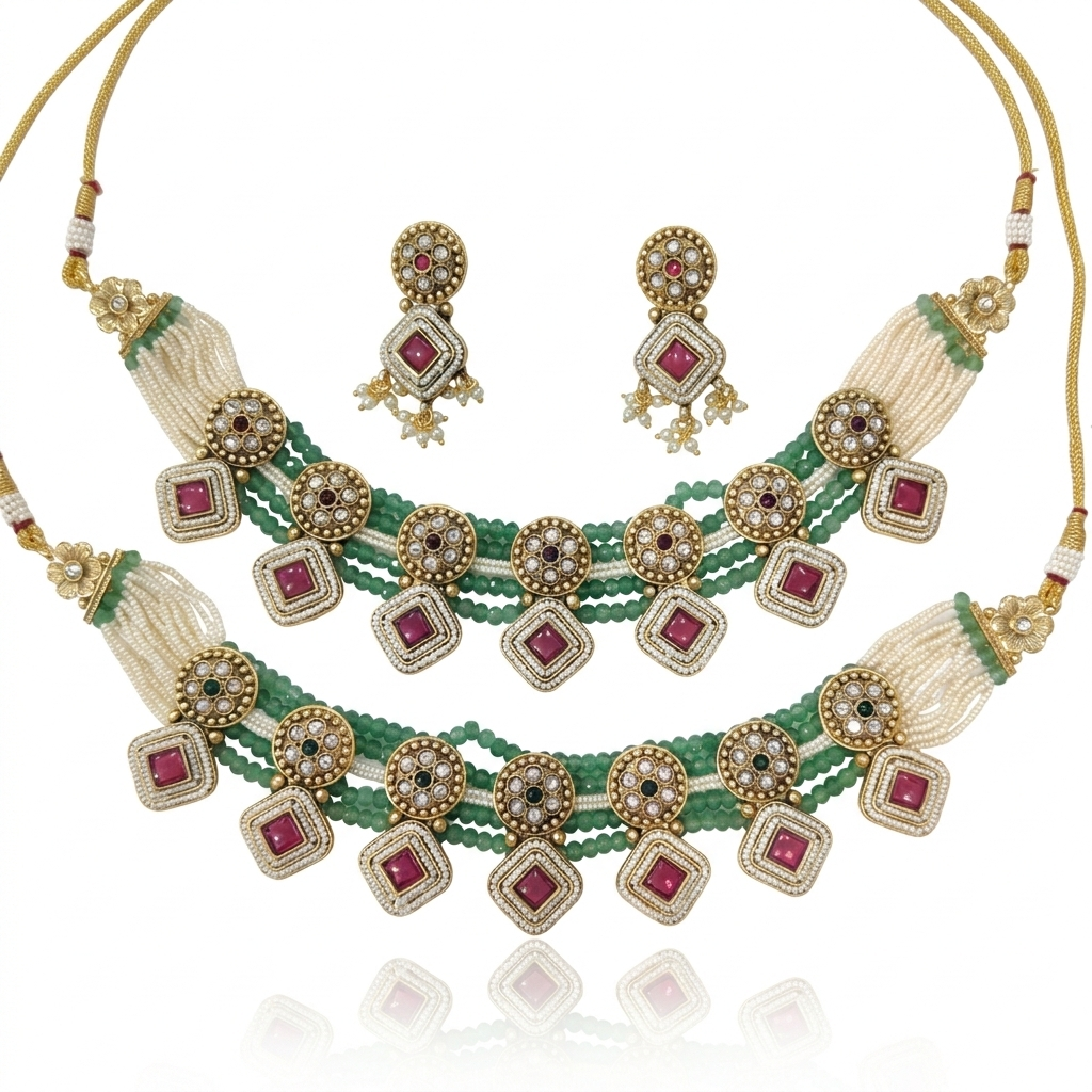 Indulge in regal elegance with this stunning Maharani Ruby Emerald Layered Pearl Necklace Set, crafted to reflect timeless royal charm. This luxurious multi-layered design features rich green bead strands paired with delicate pearl tassel accents on the sides, creating a graceful and sophisticated silhouette.