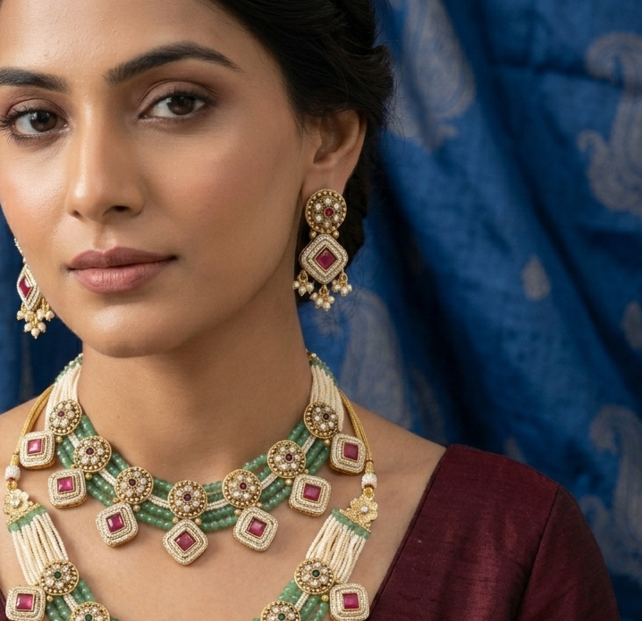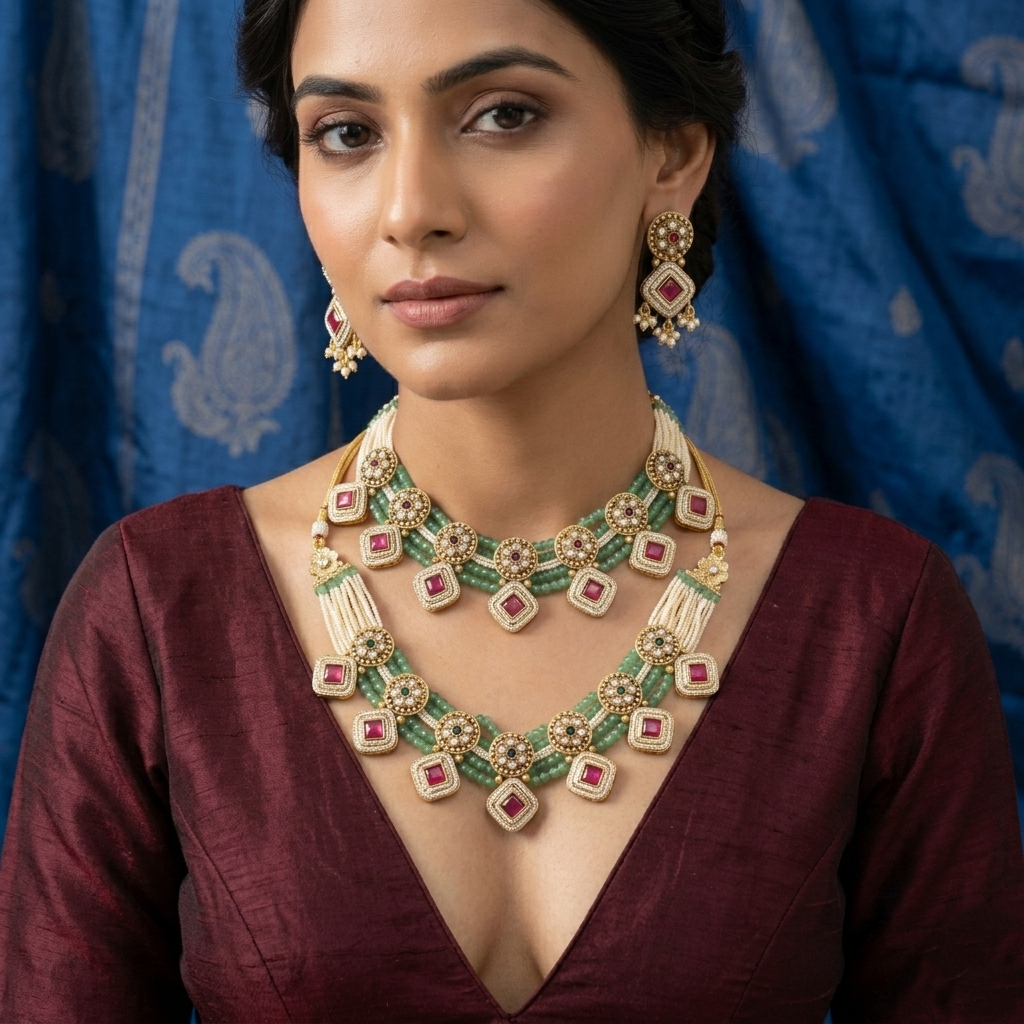Maharani Ruby Emerald Layered Pearl Necklace Set
