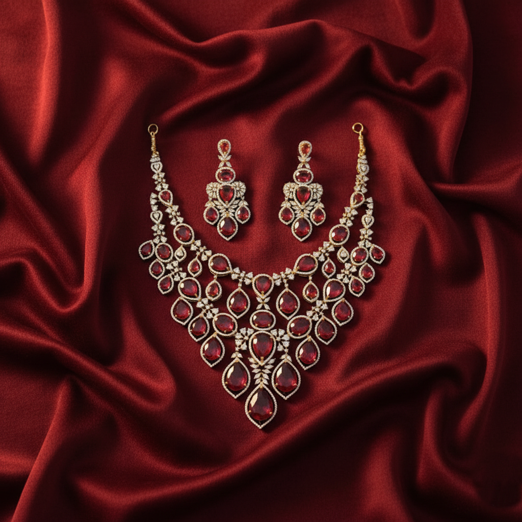 • Artistry & Finish: The set is crafted with a premium rhodium-style silver finish, providing a cool, modern contrast to the warmth of the red stones. The tapered design ensures a majestic fit that follows the natural curve of the collarbone.