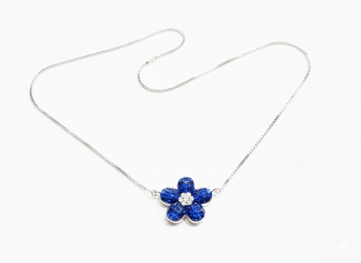 Make a bold statement with this luxurious sapphire-blue floral pendant necklace. Combining rich, royal tones with a modern faceted design, this piece is engineered to be the centerpiece of any jewelry collection.