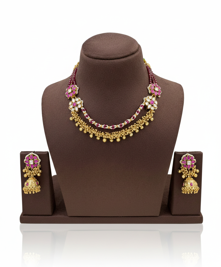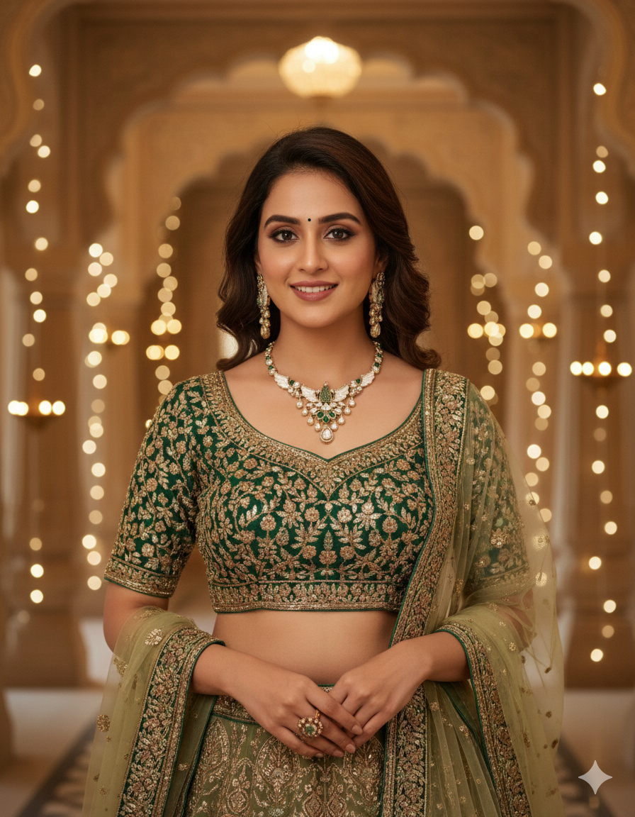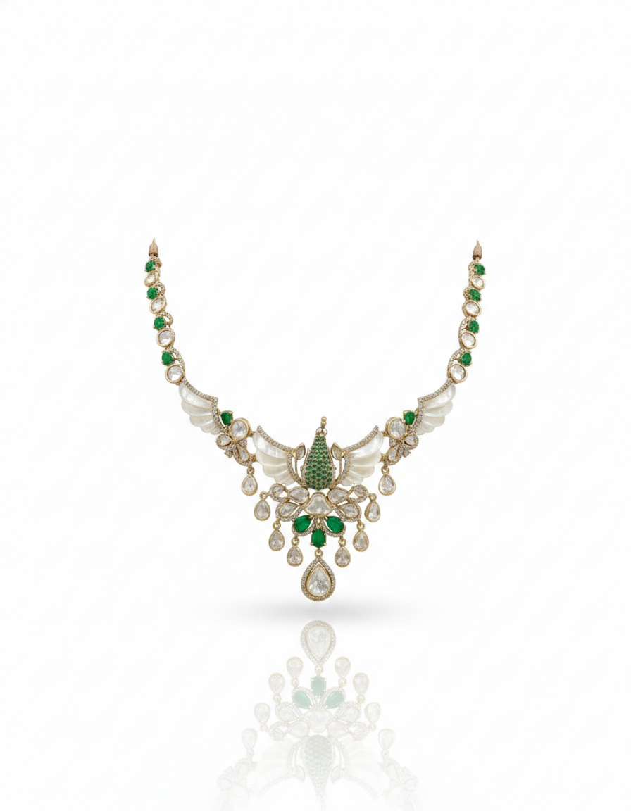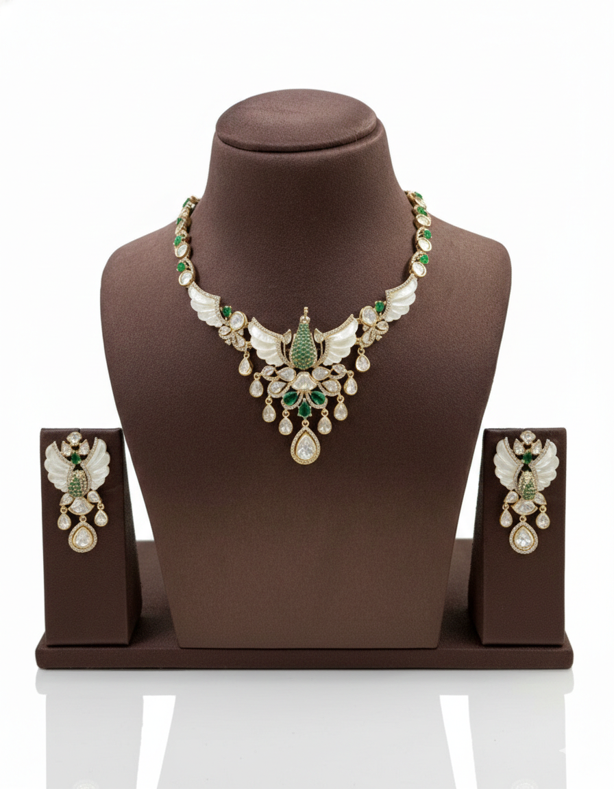 Embrace the grace and poise of a queen with this masterfully designed statement set. The necklace features a central swan-inspired motif, exquisitely carved from luminous mother-of-pearl “wings” and accented with a pave-set emerald green body. Beneath the central figure, a cascading array of pear-shaped white stones and emerald droplets creates a fluid, radiant effect. The gold-toned chain is further embellished with small emerald accents, leading to a perfectly coordinated pair of wing-design drop earrings. This set is a true work of art, perfect for high-profile weddings and grand celebrations.