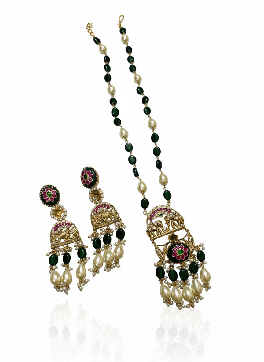 Step into the grandeur of tradition with this exquisite Temple-style jewelry set. Combining intricate gold artistry with a lush, nature-inspired palette, this set is designed to be the crowning jewel of your festive or bridal ensemble.