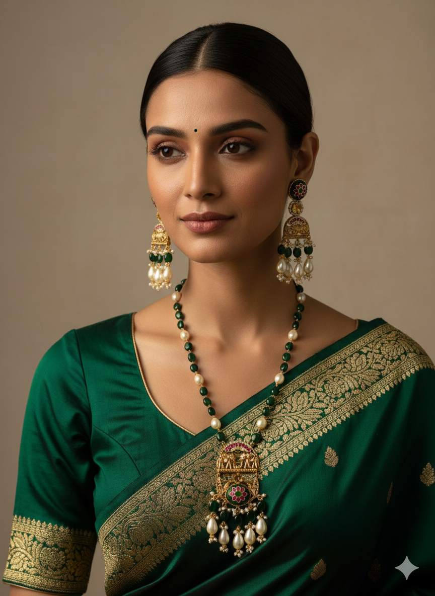 Coordinated Jhumka-Style Earrings: Includes matching statement earrings that echo the pendant’s floral motif, featuring tiered emerald and pearl drops that provide graceful movement.