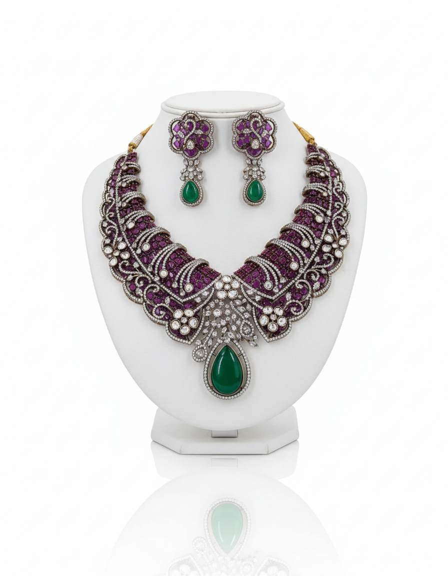 Majestic Victorian Emerald & Ruby Floral Choker – High-Impact Polki Heritage Set