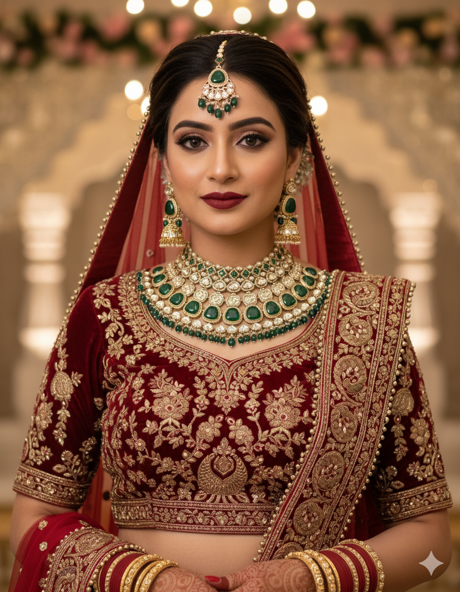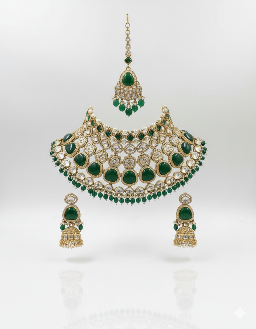 Command the room with this spectacular fusion of bold gemstones and meticulous craftsmanship. The choker is anchored by substantial, vivid green emerald centerstones, each framed by a pavé of Polki accents and crimson ruby-red floral borders. Cascading teardrop motifs add a rhythmic elegance, catching the light with every movement. Complete with matching rectangular drop earrings and a coordinated mang-tikka, this ensemble is the ultimate choice for a sophisticated bridal look or a high-profile festive celebration.