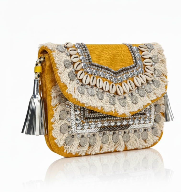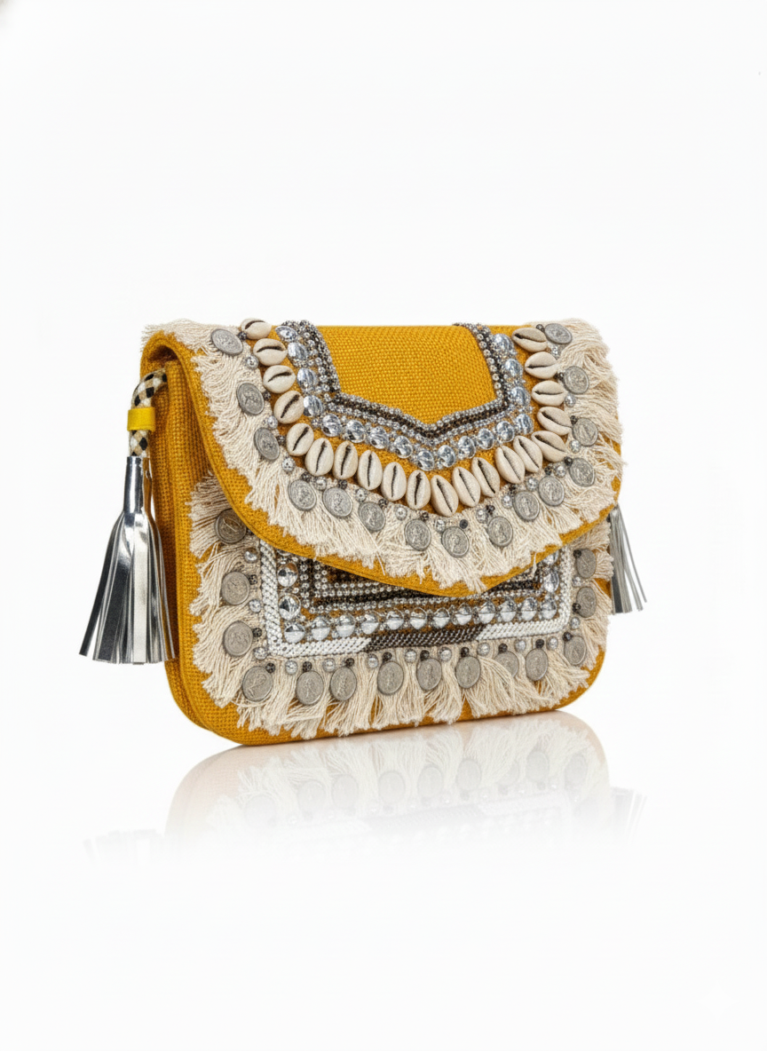 A vibrant mustard-yellow clutch adorned with cowrie shells, metallic coins, crystal beads, and soft fringes for a bold boho-luxe look.