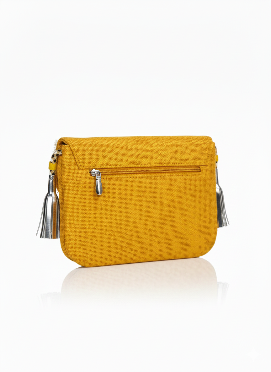 The Marigold Muse Embellished Clutch is a radiant blend of tradition and contemporary bohemian style. Crafted in a rich mustard hue, this clutch features intricate hand-embellishment with cowrie shells, metallic coin accents, crystal bead detailing, and layered fringe borders that add texture and movement. The structured flap design enhances its elegance, while tasseled side accents provide a playful finish. Perfect for festive celebrations, weddings, destination events, or statement evening outings, this clutch pairs beautifully with ethnic ensembles and modern silhouettes alike. Compact yet striking, it offers space for essentials while instantly elevating your look with artisanal charm.
