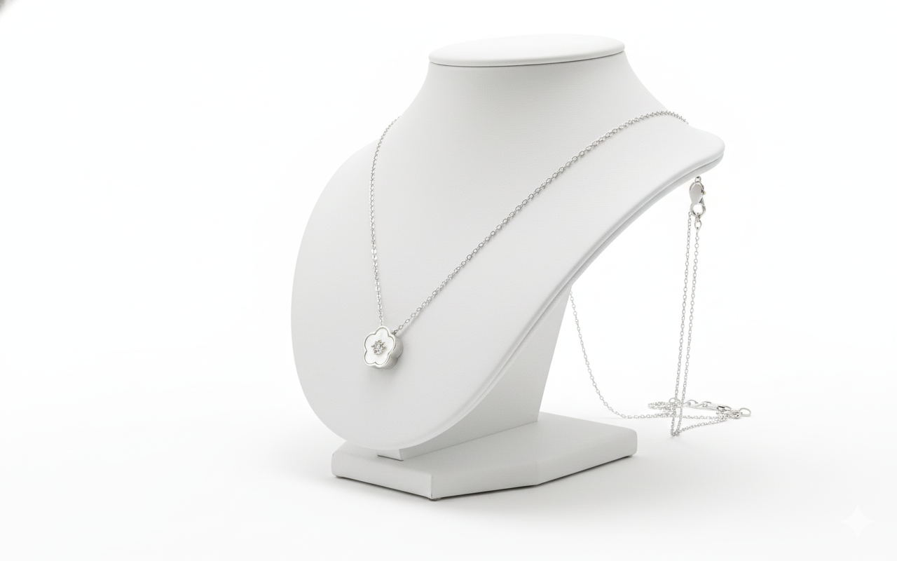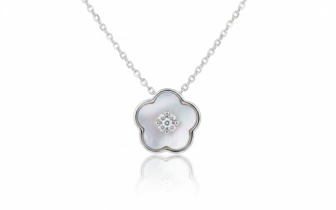 Embrace the beauty of the sea with the Maris Shell Inlay Necklace. This piece centers on a meticulously carved mother-of-pearl shell, featuring a classic fan silhouette that widens at the top and tapers to a gentle point. The natural shell offers a unique, multi-dimensional luster that shifts from creamy white to soft pink and silver under the light.