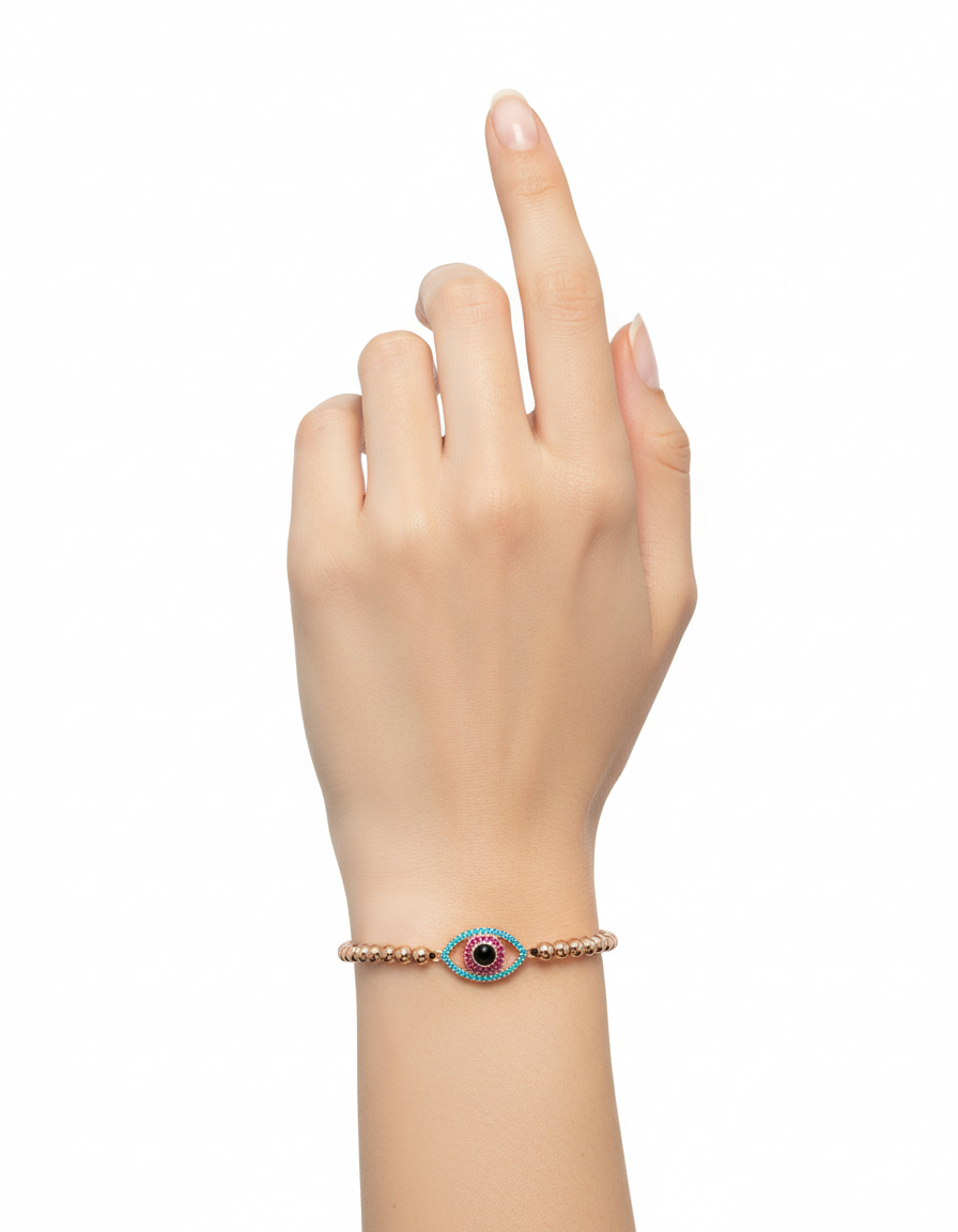 A vibrant fusion of ancient protection and modern luxury, this rose gold-tone bead bracelet features a stunning marquise-shaped Evil Eye centerpiece. Framed by concentric rows of sapphire blue, ruby pink, and turquoise pavé crystals, this adjustable piece offers a sophisticated, eye-catching glow.