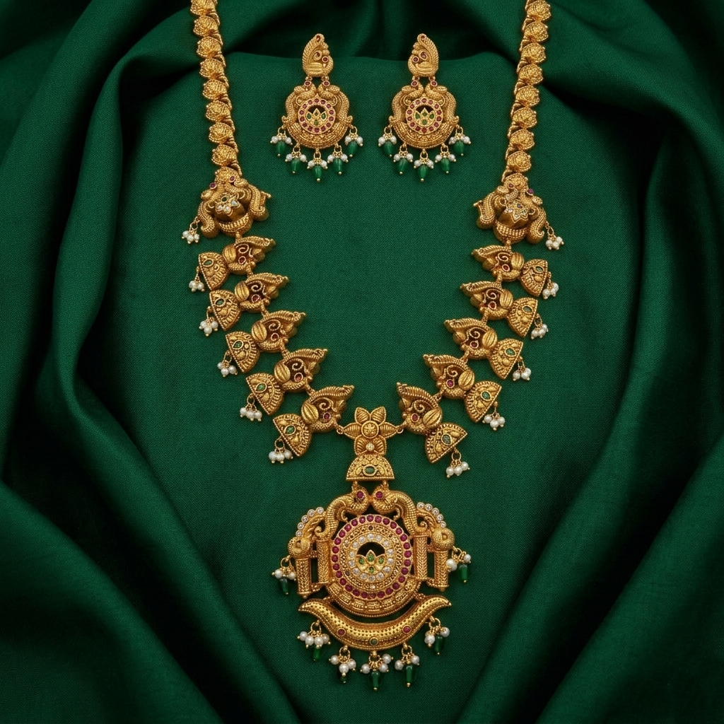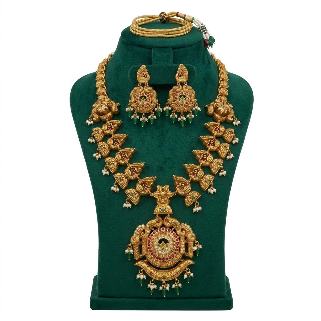 The Statement Necklace: The focal piece is a wide, tiered collar necklace with a rich antique gold finish. It features graduating rows of circular and petal-shaped motifs, each meticulously engraved with floral patterns.