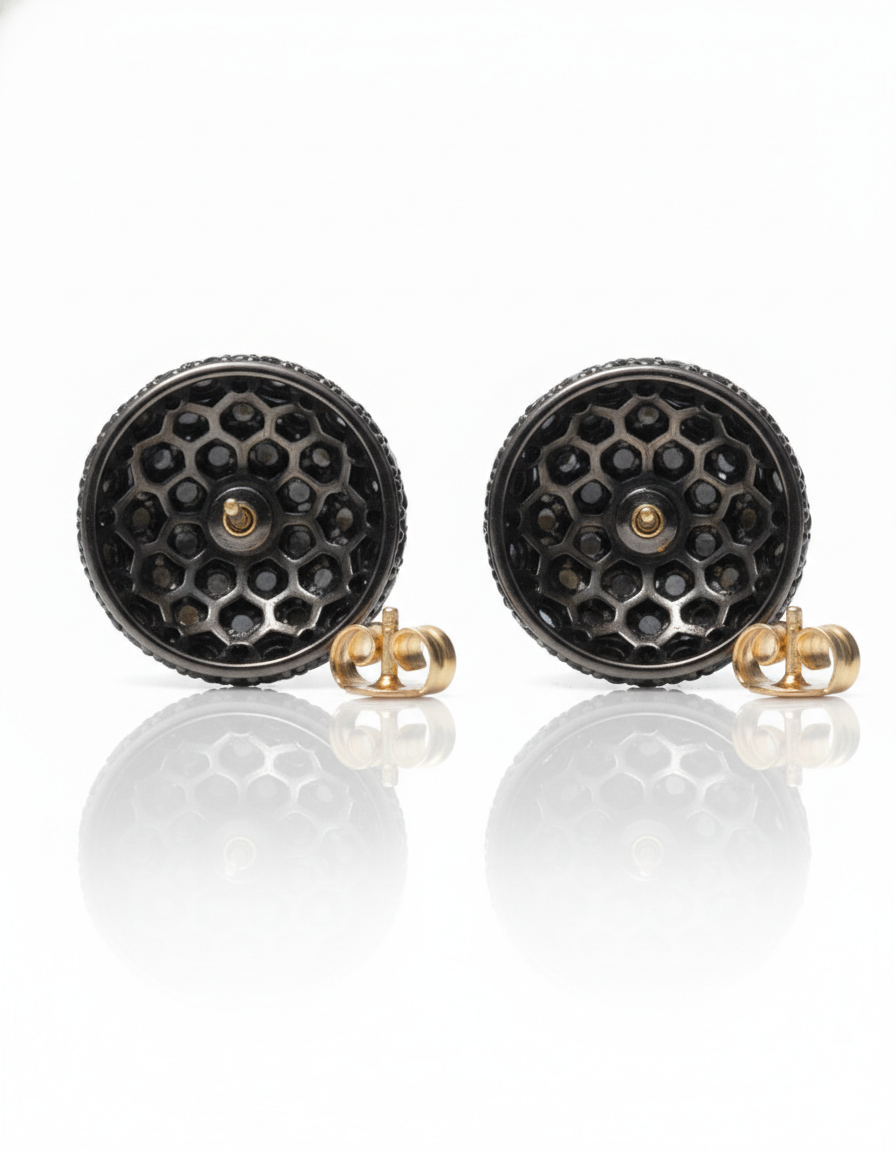 The deep, monochromatic finish creates a sophisticated play of light and shadow, offering a subtle yet captivating sparkle. Whether paired with a sharp evening suit or a casual streetwear look, these dome studs provide a seamless blend of modern minimalism and high-end glamour.