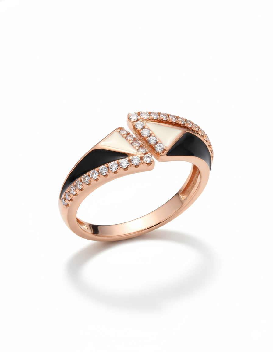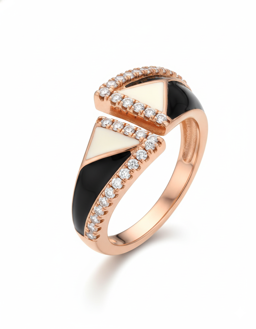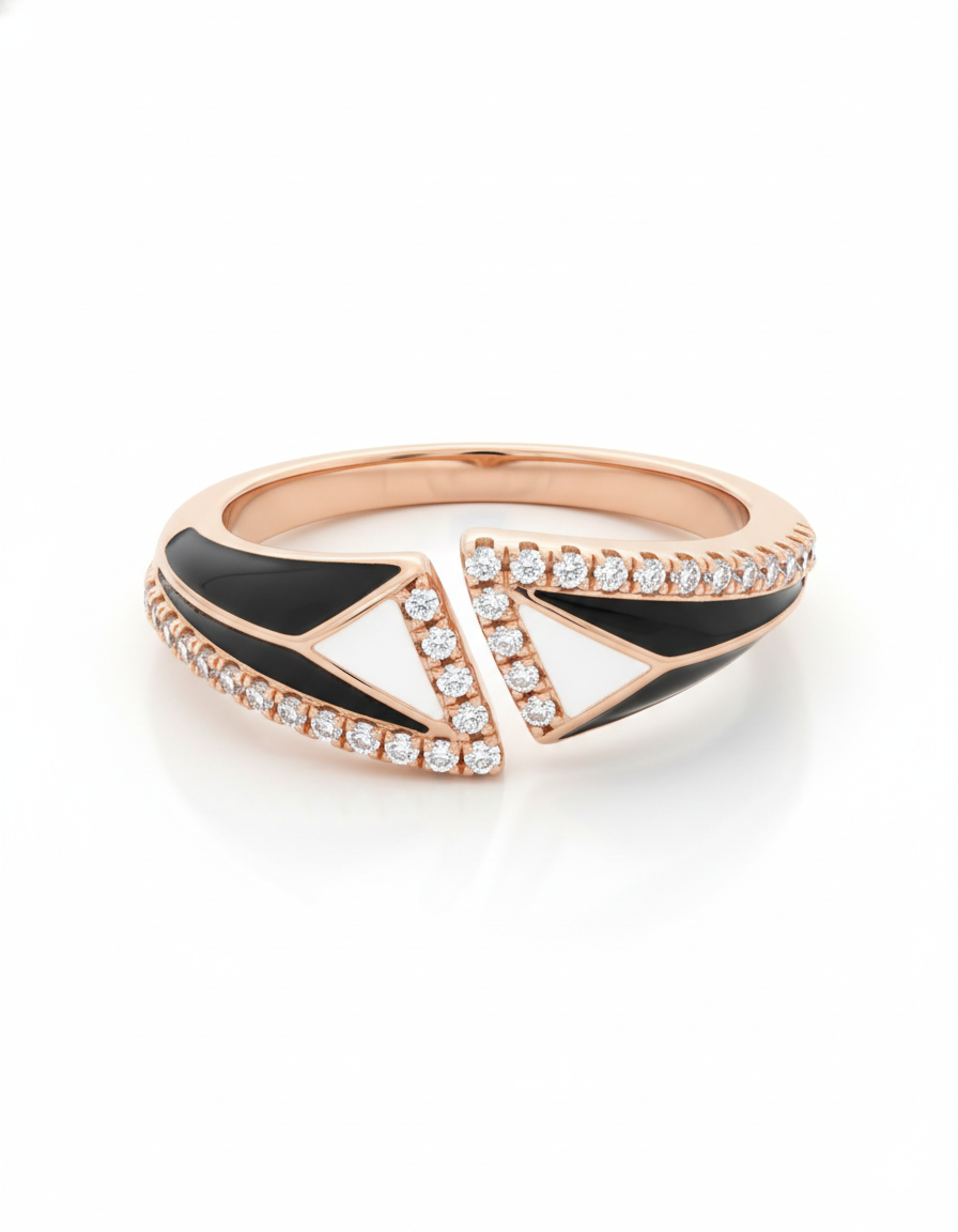 This striking ring blends contemporary elegance with artistic flair, featuring sleek black enamel panels framed in warm rose gold. Brilliant pavé-set diamonds highlight the geometric curves, creating a captivating contrast of light and depth. Designed for those who love statement jewelry, it adds confidence and sophistication to any look