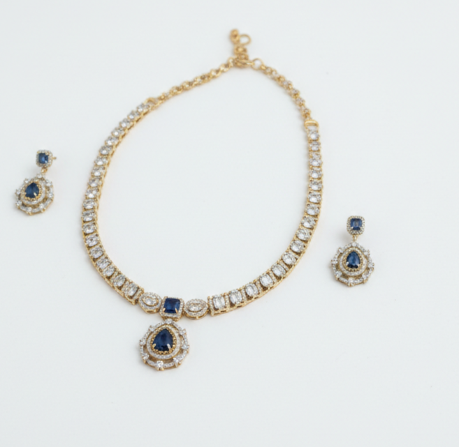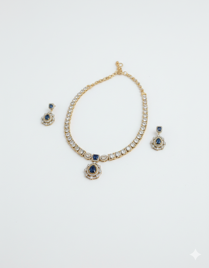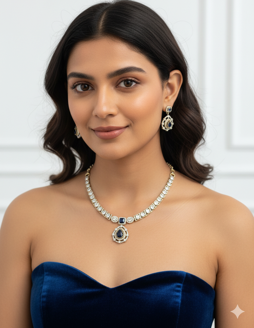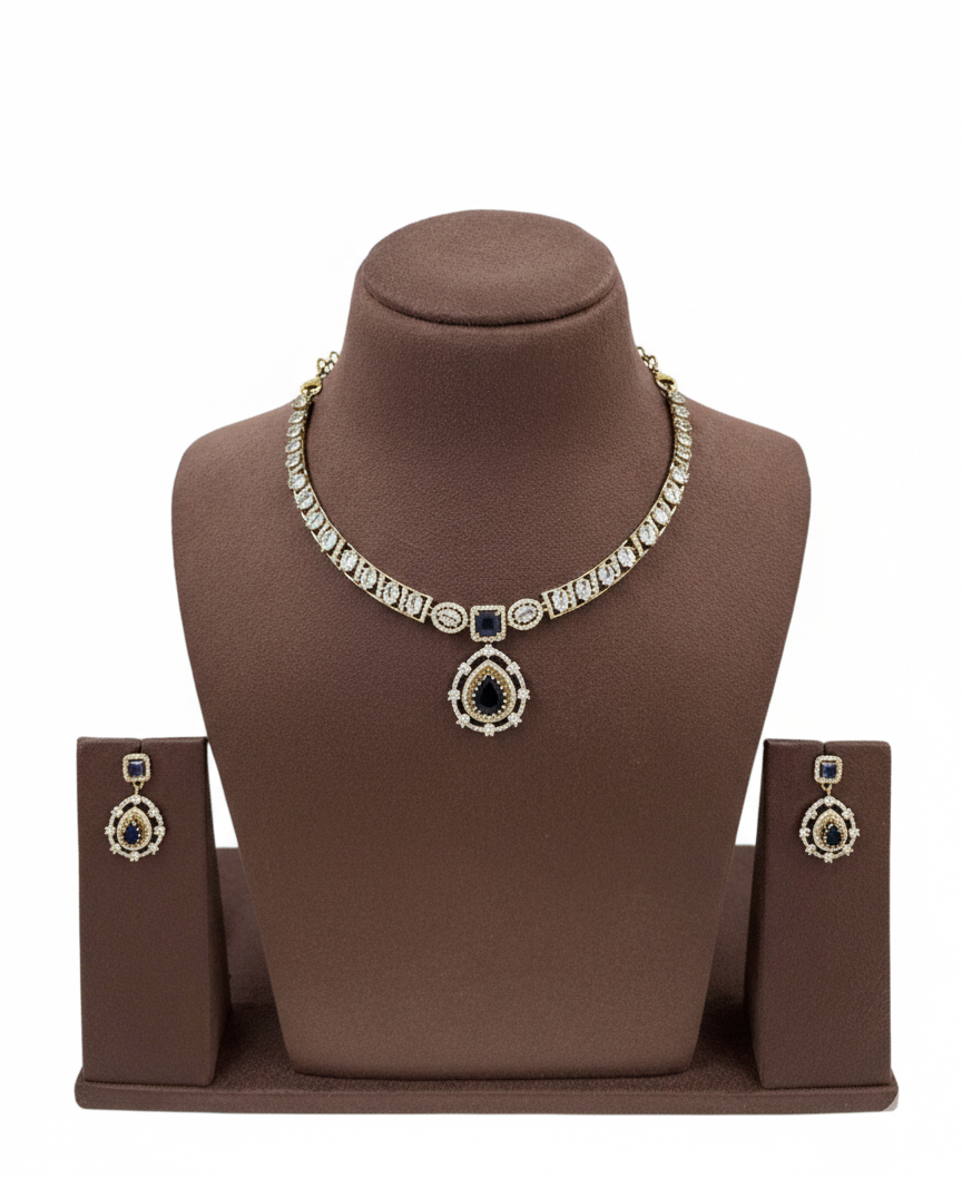 The Midnight Grace Diamond Necklace & Earring Set embodies understated luxury with a touch of mystery. Designed with a sleek line of sparkling stones, the necklace is accented by a deep midnight-hued centerpiece that flows into a delicate teardrop pendant framed with brilliant detailing. The matching earrings echo the same graceful silhouette, completing the look with refined symmetry.
