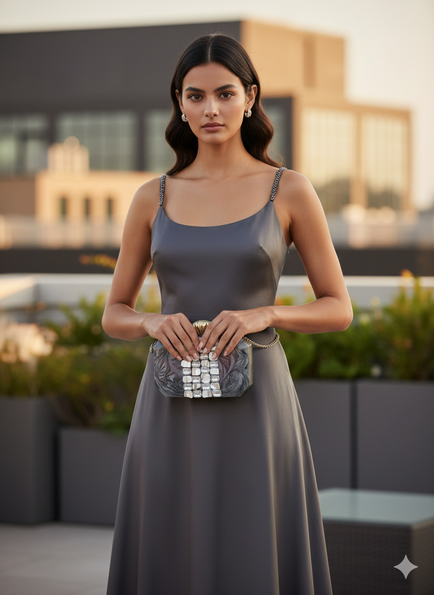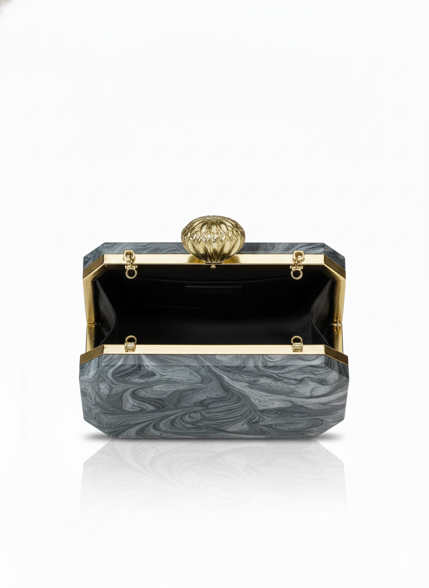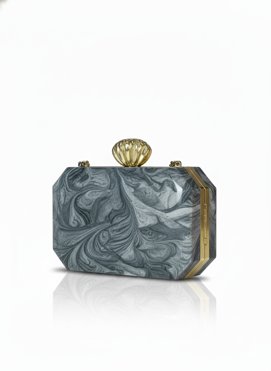 This sophisticated hard-shell box clutch is a study in monochromatic luxury. The body of the bag features a stunning grey and black marbled resin finish, creating a fluid, swirling pattern reminiscent of natural stone. Down the center, it is embellished with a wide vertical band of hand-inlaid mother-of-pearl tiles and clear emerald-cut crystals, adding a luminous, prismatic glow. The clutch is crowned with a vintage-inspired gold shell clasp that provides a regal contrast to the cool tones of the body. Designed with an octagonal silhouette, this piece is the perfect high-fashion accessory for formal galas and cocktail evenings.