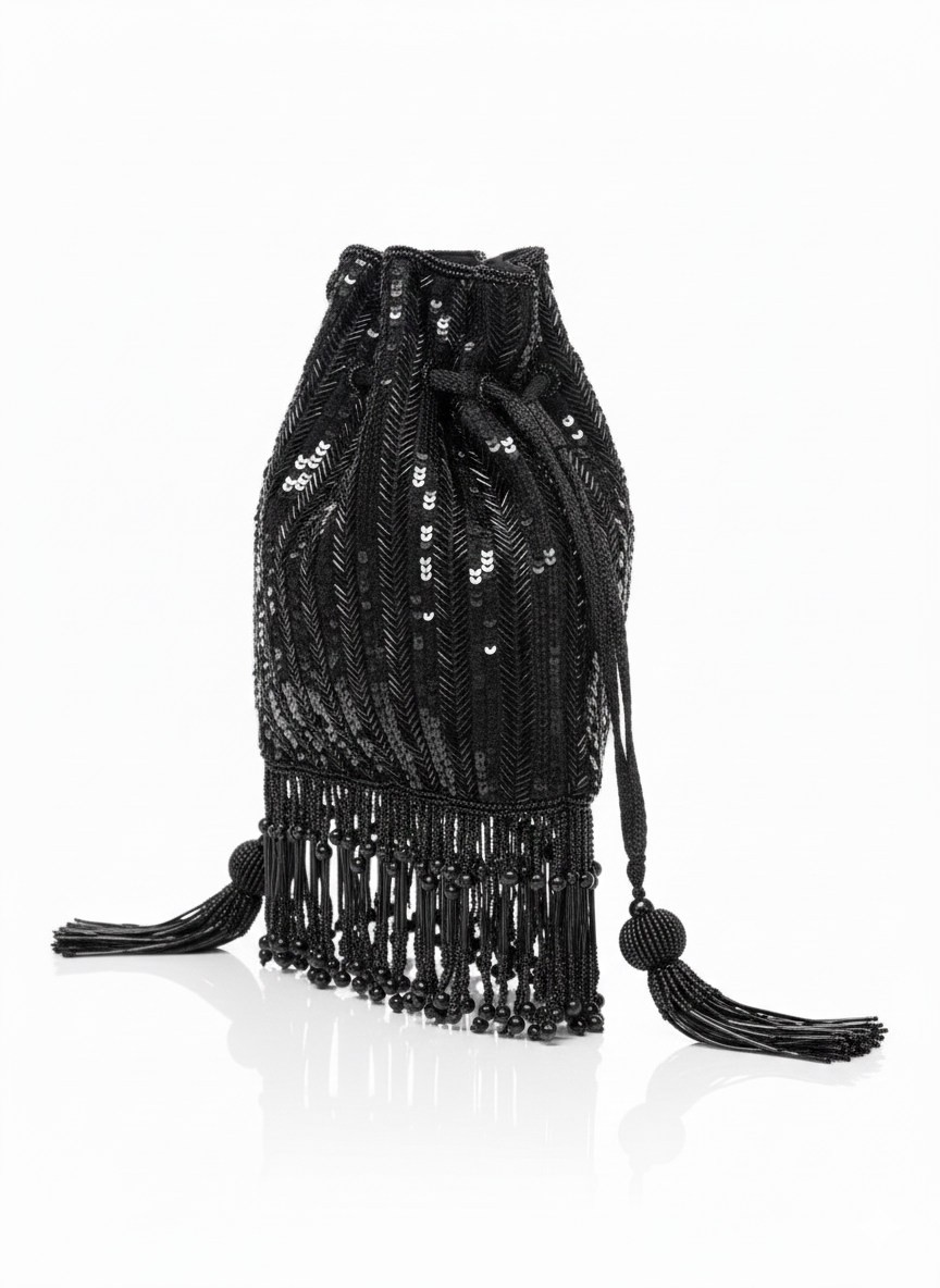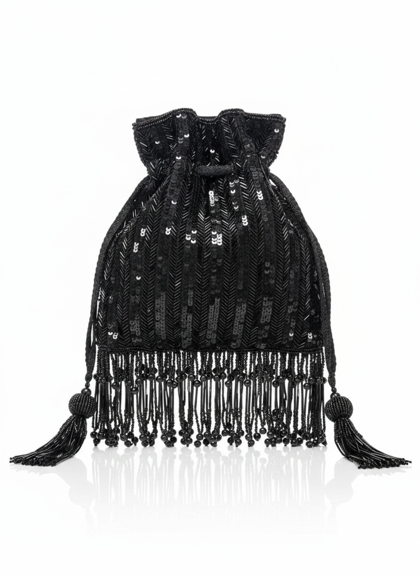 A luxurious black potli bag adorned with delicate sequins, intricate beadwork, and elegant tassel fringes—perfect for festive and evening occasions.