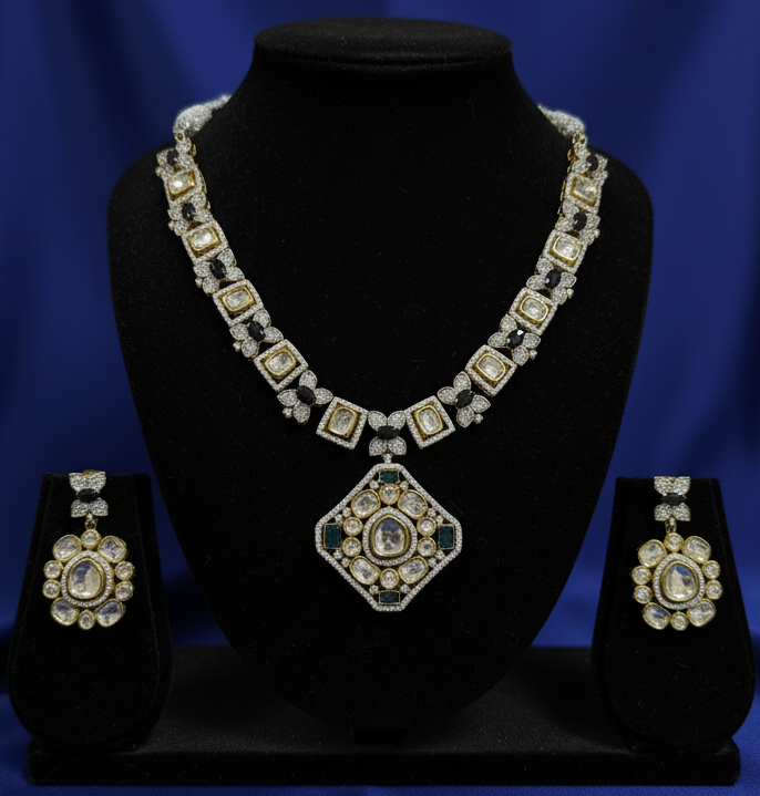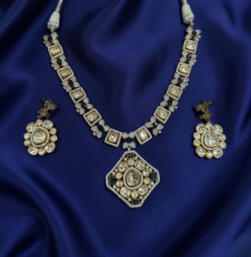 A bold and sophisticated jewelry set featuring antique-cut Polki stones accented by deep midnight sapphires, designed to command attention with its geometric precision and vintage charm.