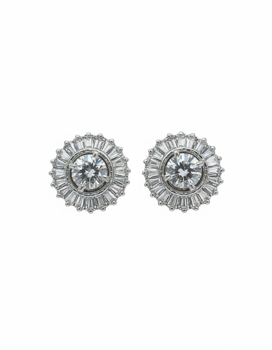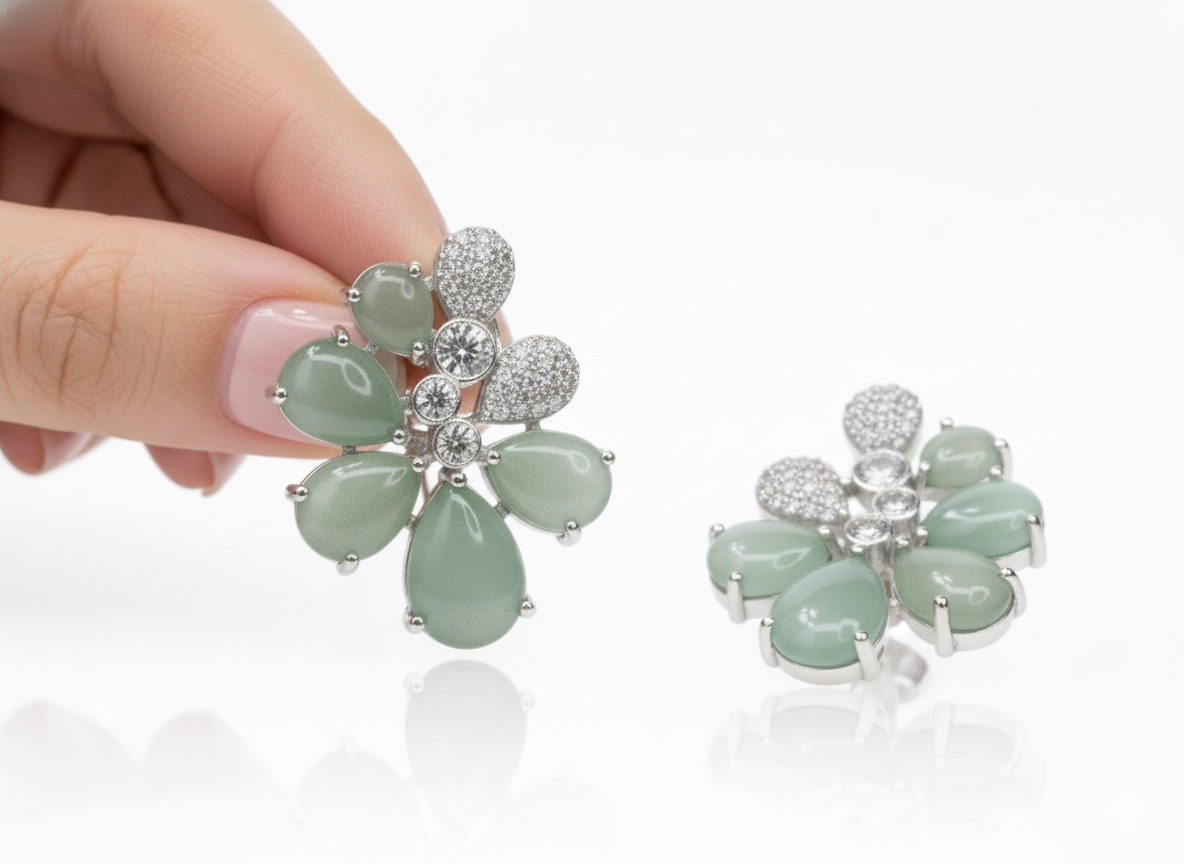 Exquisite floral-inspired stud earrings featuring serene mint green teardrop stones and a radiant white stone center. A sophisticated silver-finish design that combines organic shapes with high-end brilliance.