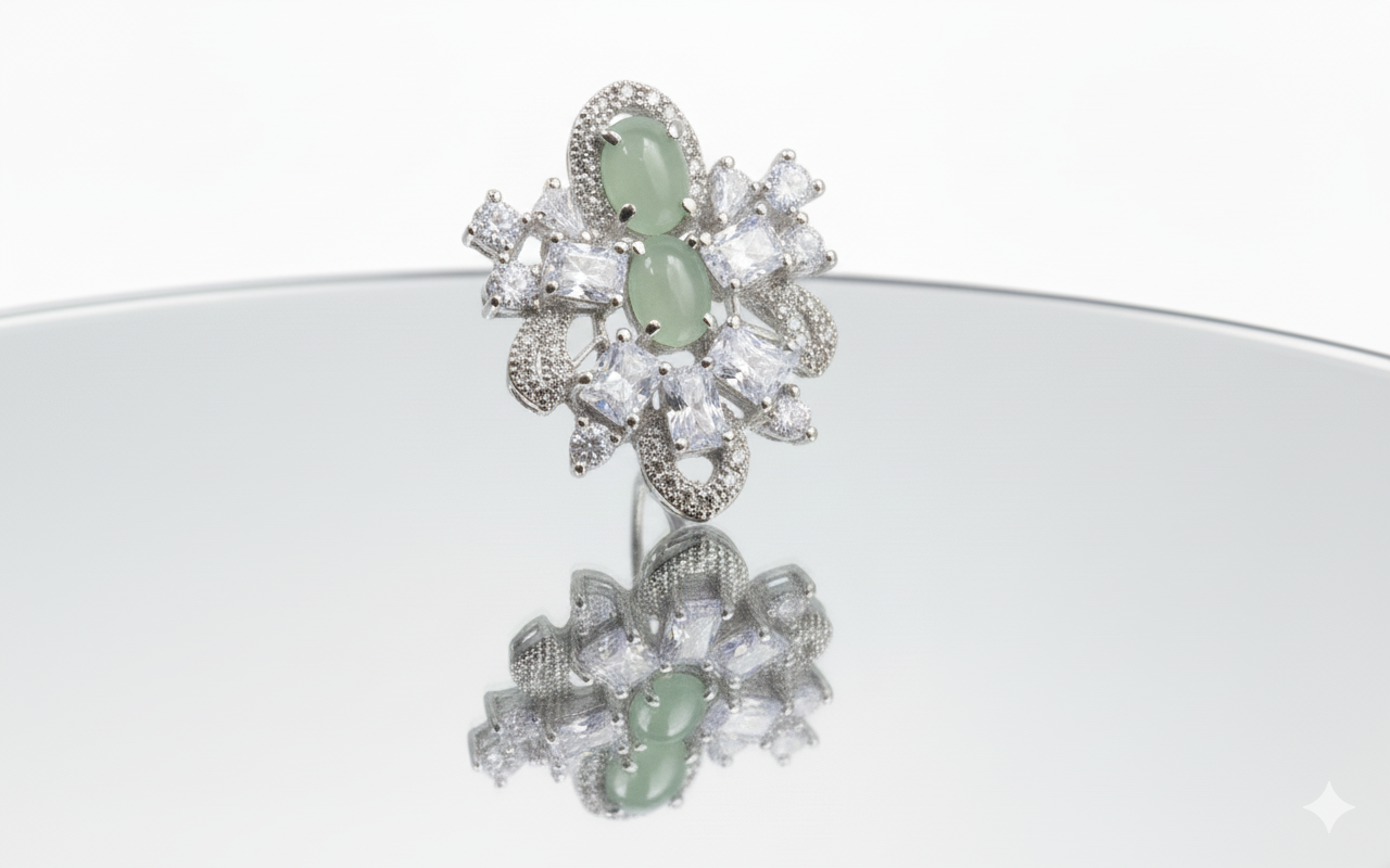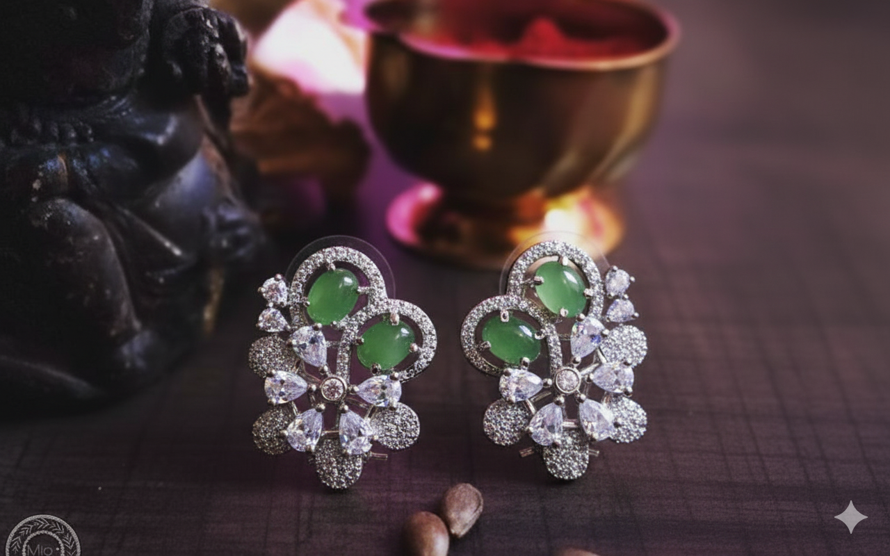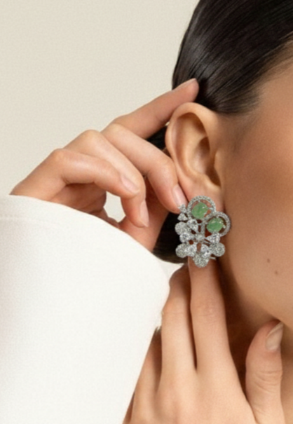 Stunning silver-finish floral stud earrings featuring serene mint-green cabochons and a radiant cluster of pear-cut stones. A sophisticated, nature-inspired design that offers a perfect blend of modern luxury and timeless charm.