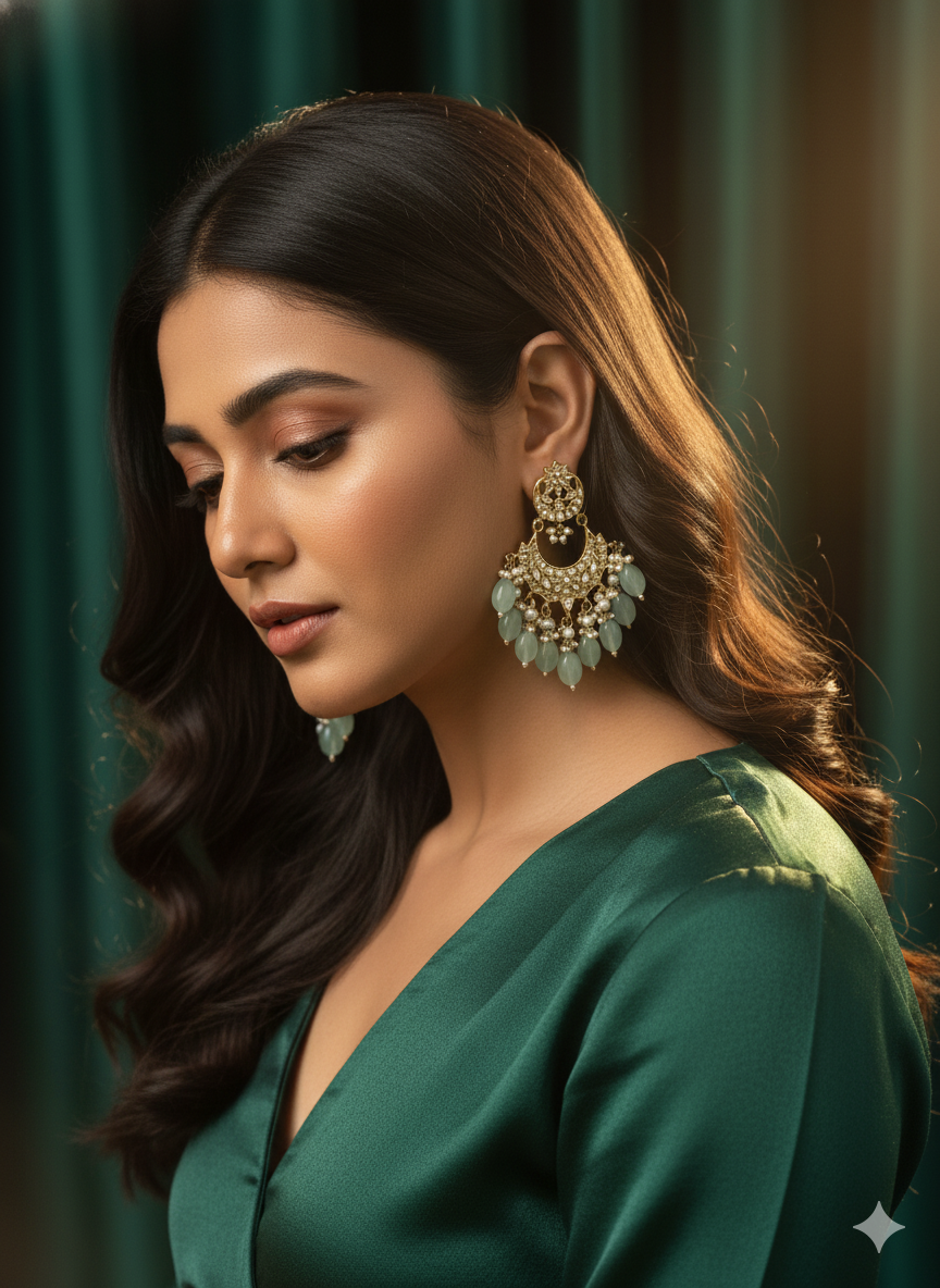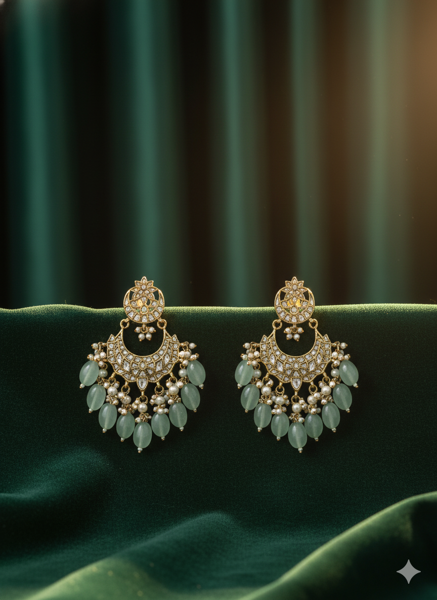 Elegant Kundan Chandbali Earrings accented with refreshing mint green onyx drops and delicate pearl clusters. These antique gold-plated earrings combine traditional crescent artistry with a contemporary color palette, perfect for making a regal statement.