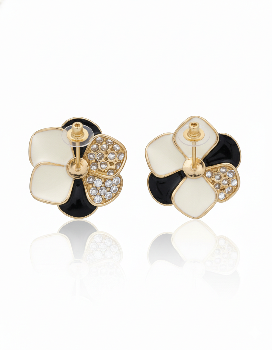 A striking blend of modern contrast and botanical elegance, these floral stud earrings feature hand-painted enamel petals in sophisticated black and ivory. Accented with a sparkling crystal-encrusted petal and a golden stamen center, these studs offer a bold yet timeless statement.