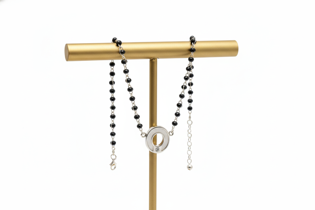 The chain is meticulously crafted with a rhythmic sequence of faceted black beads, each linked by a fine metal chain to provide fluid movement and comfort. Finished with a secure lobster claw clasp and an adjustable extender chain, this piece is designed for a custom fit, making it a versatile addition to any jewelry stack or a meaningful solo statement.