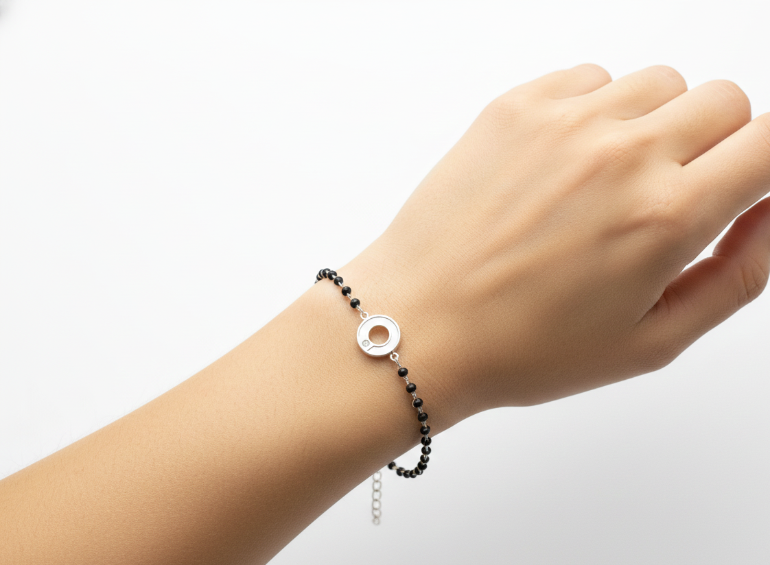 A contemporary take on traditional elegance, this black bead chain bracelet features a central Mother-of-Pearl circular motif. Set in polished white gold-tone metal and accented with a single sparkling stone, this minimalist piece offers a striking contrast of light and dark for a sophisticated everyday look.