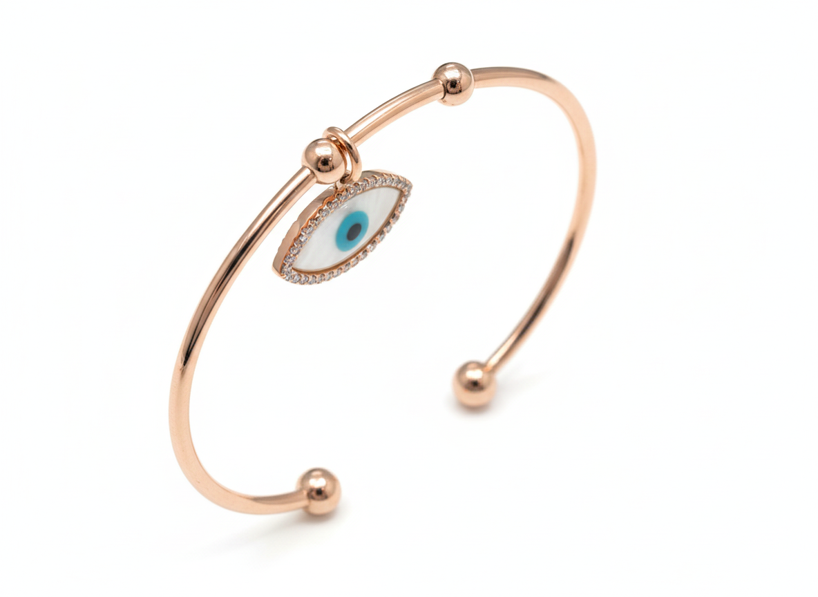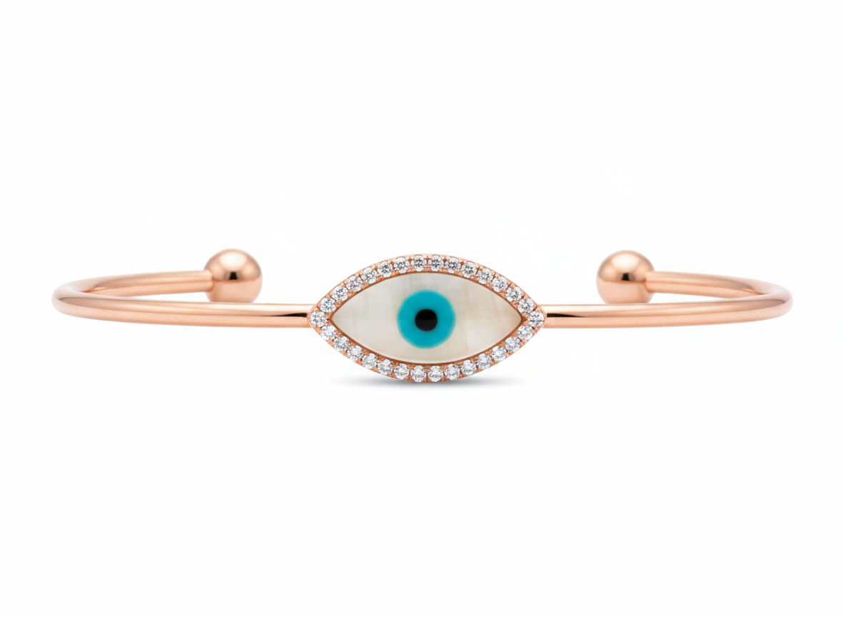 A delicate and protective statement piece, this rose gold cuff features a shimmering mother-of-pearl Evil Eye charm. Ringed with brilliant diamond-cut accents, this adjustable bangle combines mystical tradition with a sleek, contemporary aesthetic.